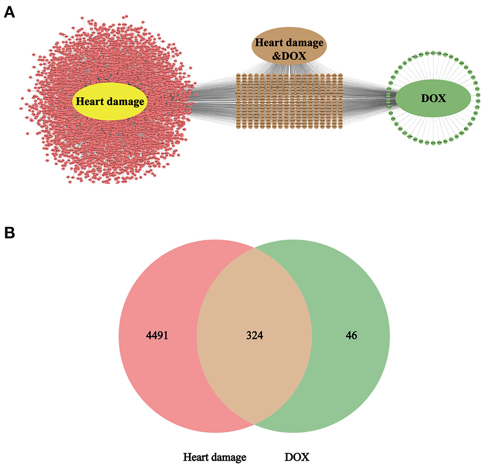 According to the retrieval, there are 13,984 targets in the heart damage and 8058 targets in the DOX; control the accuracy and quantity of targets, heart damage and DOX targets were screened by correlation score ≥ 3 and interaction count ≥ 5, respectively. Finally, there are 4,815 targets in the heart damage part and 370 targets in the DOX part (Figure 3A), among which there were 324 identical targets (Figure 3B).