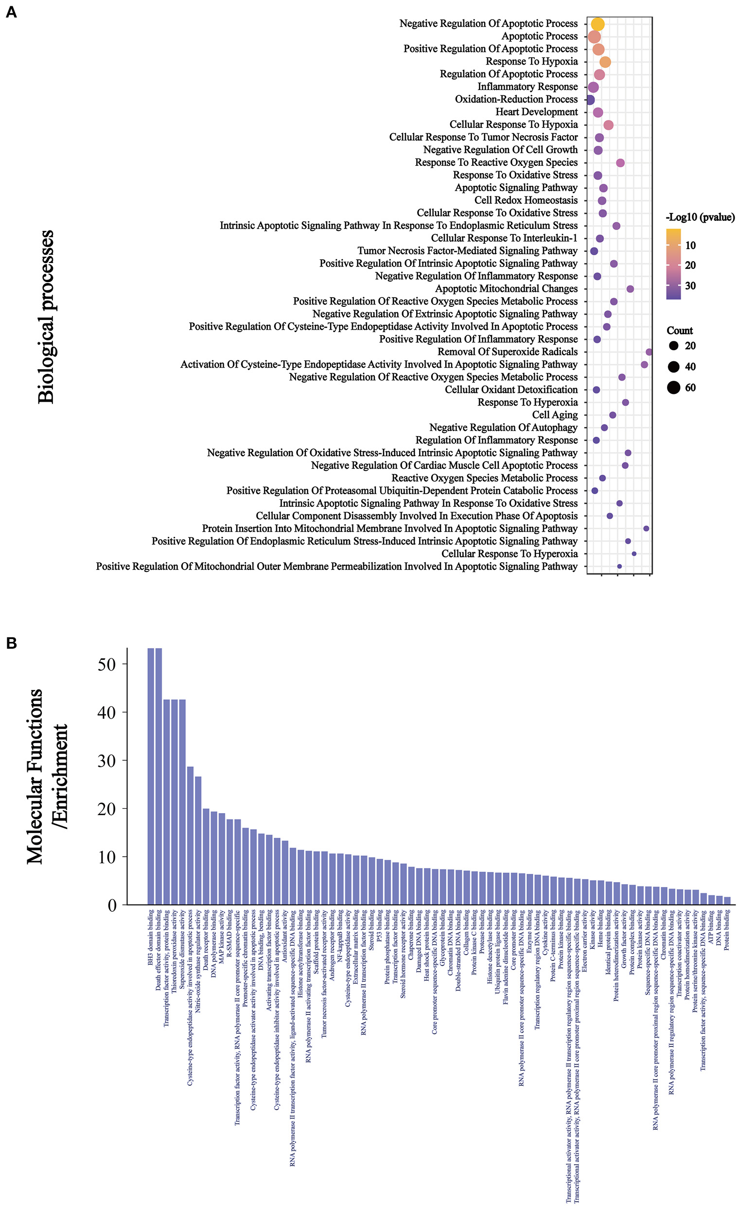 The BP (A) related to oxidative stress, inflammation, and apoptosis were ranked according to the number of related targets and all the MF (B).