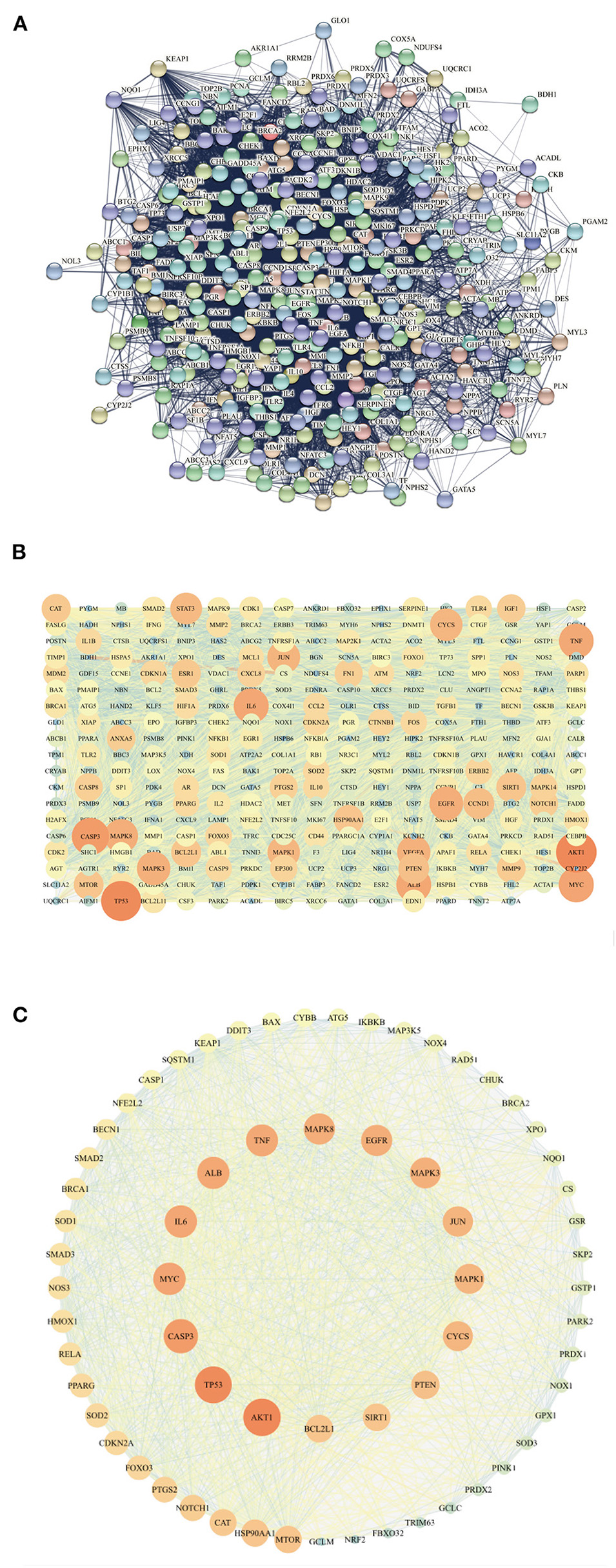 The intersection targets were imported into STRING (Figure 5A), and the results were imported into Cytoscape3.7.1. The constructed network graph had 321 points and 9,429 edges (Figure 5B). In GO analysis, the relationship between ubiquitin protein ligase binding and Keap1 was the key to investigating anti DOX-induced myocardial oxidative damage. Therefore, Keap1 related targets were extracted into a new network (Figure 5C), which had 65 nodes and 1,121 edges. We can see that SOD, CAT, and GPX1 are related to oxidative stress, CASP3, BCL2, CASP1, and BAX are related to apoptosis, TNF and IL-6 are related to inflammation, and Keap1, Nrf2, and NQO1 are targets of the Keap1-Nrf2/NQO1 pathway.
