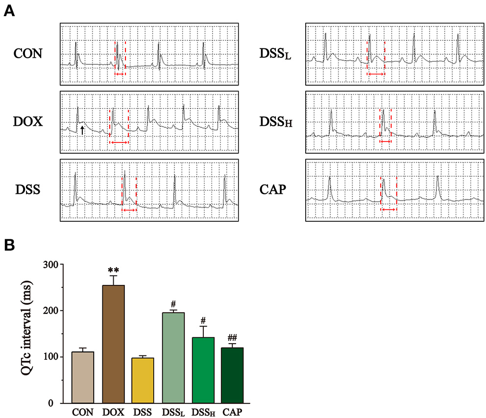 Effect of DSS on the ECG of DOX-induced cardiac injury in mice. (A) Representative electrocardiograms of each group. Black arrows mark ST-segment elevation and red arrows mark QT interval. (B) Statistics of QTc interval for each group. Data are presented as the mean ± SEM (n = 3). **P < 0.01 vs. CON; #P < 0.05; and ##P < 0.01 vs. DOX.