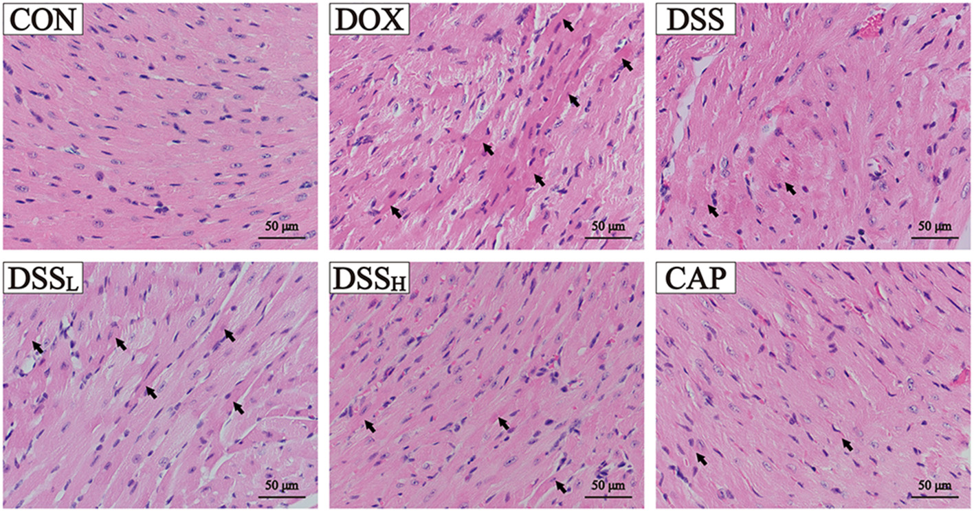Effects of DSS on pathological changes of cardiac tissue as surveyed by H&E staining. DSS on H&E staining in DOX-induced cardiotoxicity in mice. Scale bar = 50 μm (400×).