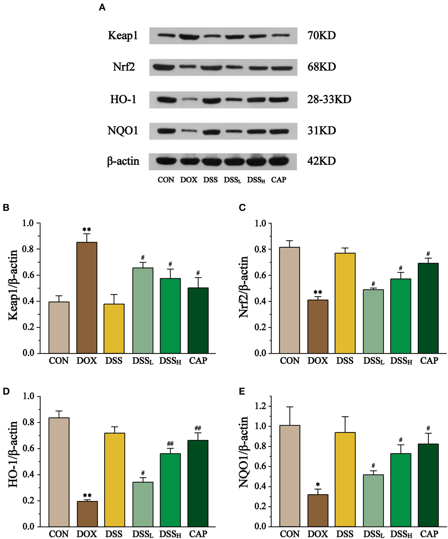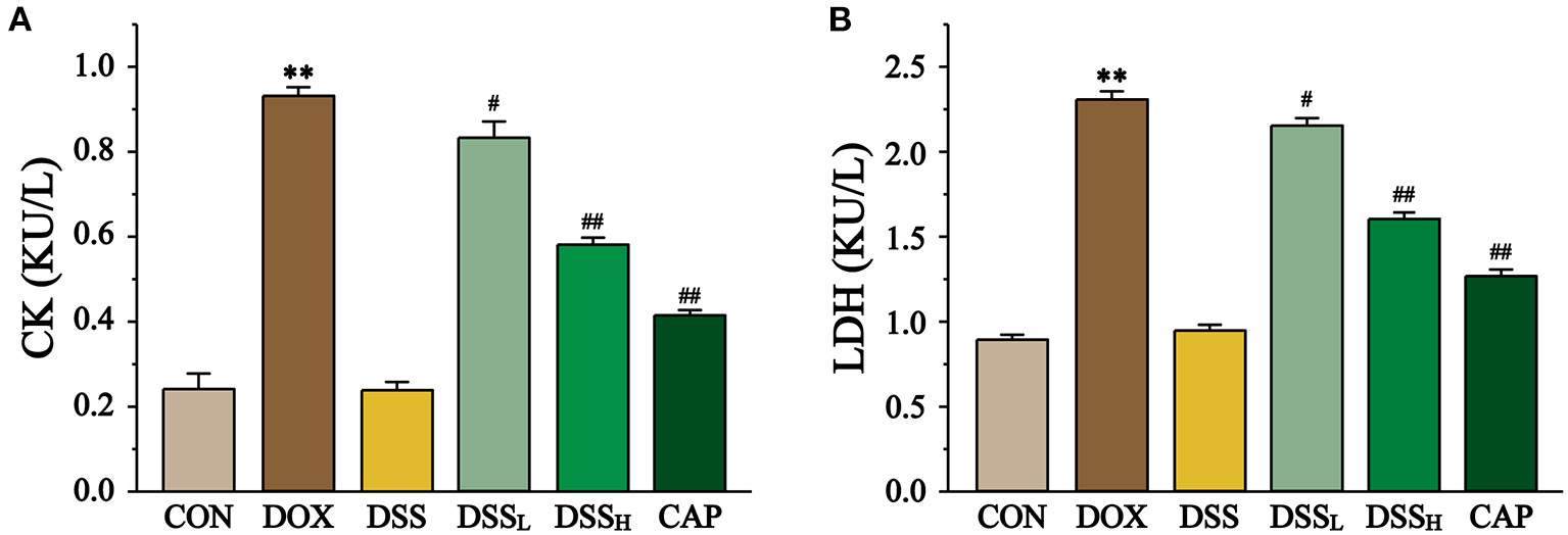 Effect of DSS on CK (A) and LDH (B) activities in DOX-induced cardiotoxicity in mice. Serum was collected from mice hearts of the CON, DOX, CAP, DSSL, DSSH, and DSS. Data are presented as the mean ± SEM (n = 10). **P < 0.01 vs. CON; #P < 0.05; and ##P < 0.01 vs. DOX.