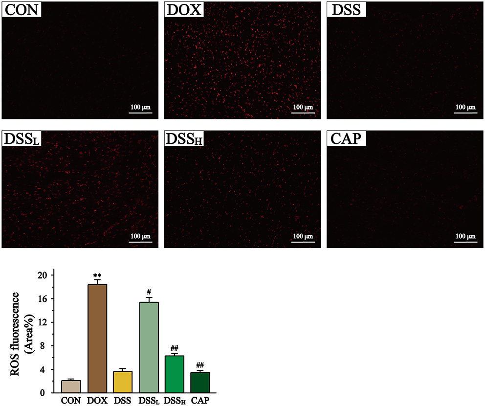 In Figure 9, ROS content was quantified as fluorescence staining area. The ROS content in DOX group was 8.9 times higher than that in CON group (P < 0.01). And compared to the DOX group, the ROS content was reduced by 16.3 and 65.8% in the DSSL and DSSH groups, respectively (P < 0.01). There was no significant difference between the CON and DSS groups.