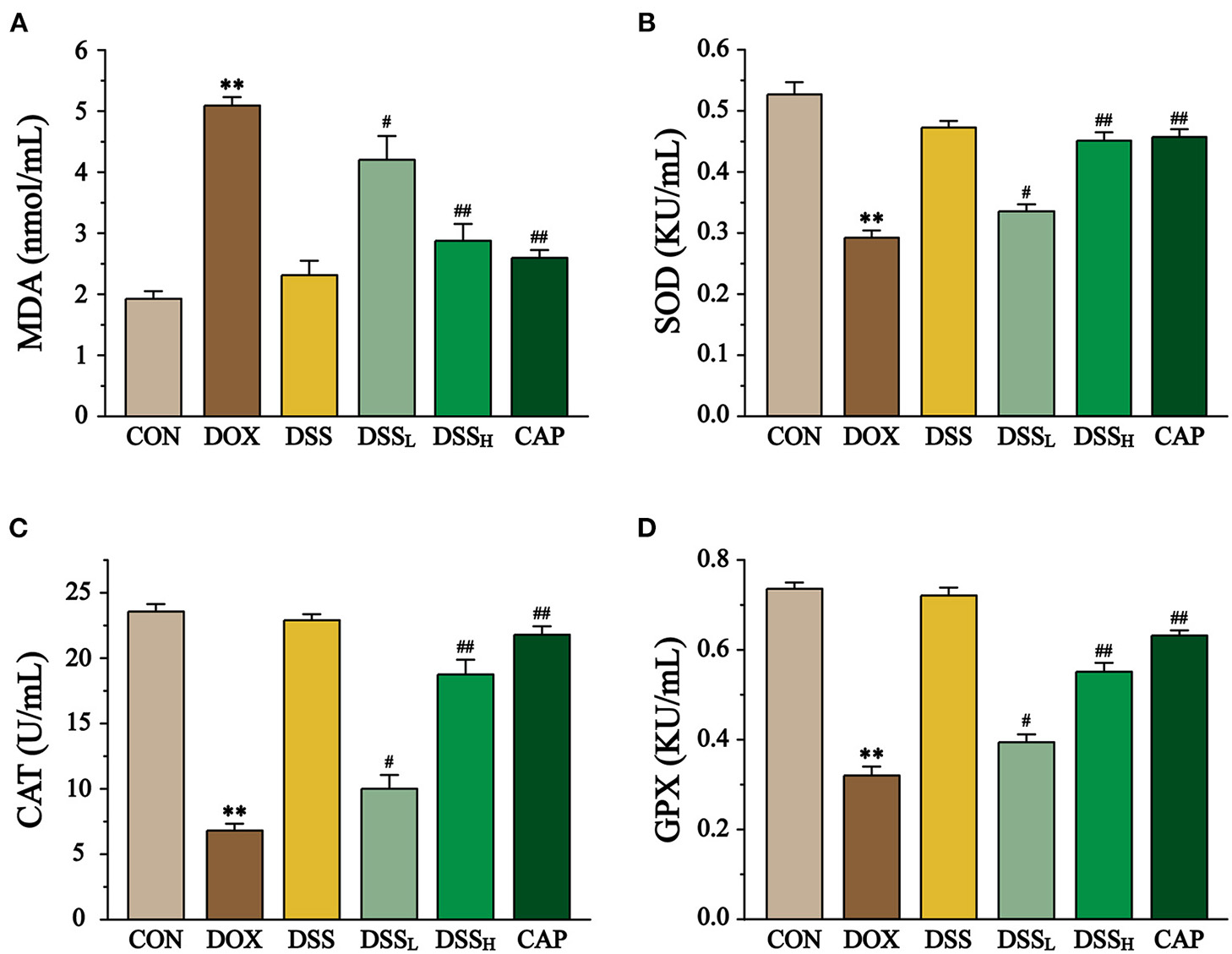 Effect of DSS on MDA content (A), SOD (B), CAT (C), GPX (D) activities in DOX-induced cardiotoxicity in mice. Serum was collected from mice of the CON, DOX, DSS, DSSL, DSSH, and CAP. Data are presented as the mean ± SEM (n = 10, n=10). **P < 0.01 vs. CON; #P < 0.05; and ##P < 0.01 vs. DOX.