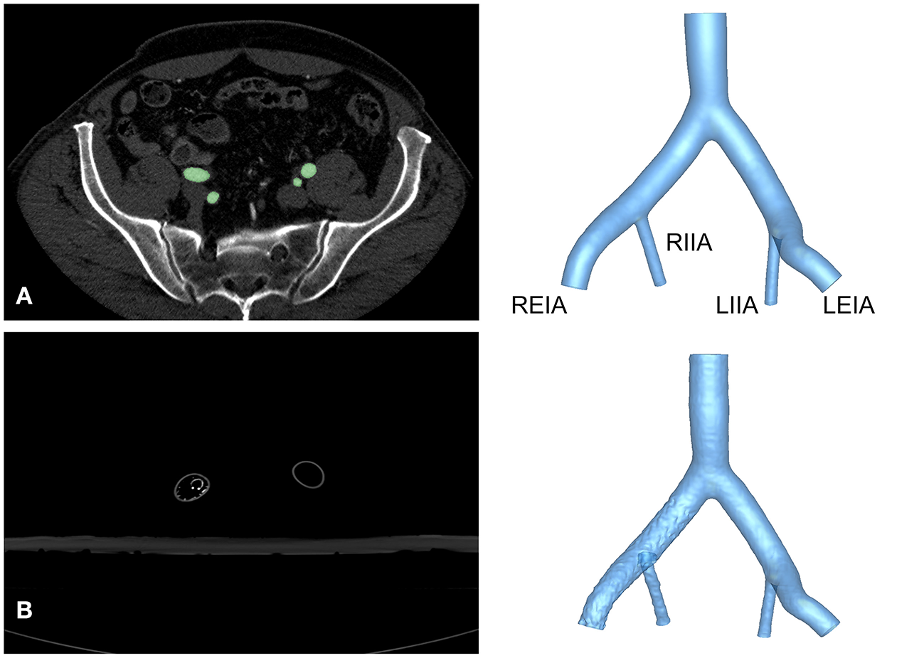 Reconstruction of the iliac artery model. (A) Axial view of CTA images from a healthy volunteer and reconstructed structure of Model A. (B) Axial view of CTA images and reconstruction of Model B. LEIA, left external iliac artery; LIIA, left internal iliac artery; REIA, right external iliac artery; RIIA, right internal iliac artery.
