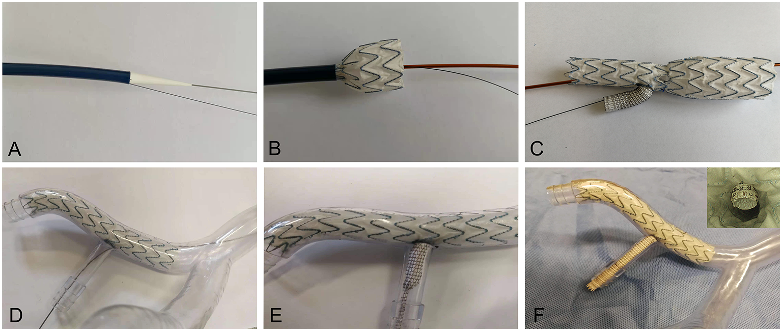 Release of the IBD in the iliac artery model. (A) The IBD transporter and guide wire (B,C) in the in-vitro release simulation. (D) The IBD was inserted through the REIA. (E) The VIABAHN was implanted into the RIIA. (F) The IBD was added into the iliac artery model, and endoscopy was used to visualize the embedded configuration. REIA, right external iliac artery; RIIA, right internal iliac artery; IBD, iliac branch device.