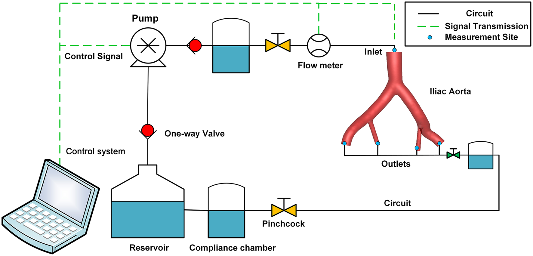 The iliac artery model produced by 3D printing was inserted into the custom-made MCL, which had been described in a previous study (21). The MCL consisted of a control system, the Windkessel model, and a reservoir (Figure 3). The blood analog fluid was 40% glycerine in water, with a density of 1,050 kg/m3 and a viscosity of 4.1 cP. A hydraulic transducer (HSCDANT005PGAA5; Honeywell, Morristown, NJ, USA) and an ultrasonic flowmeter (ME20PXL291 or ME9PXL1668; Transonic Systems, NY, USA) were used to measure the haemodynamic parameters of the model.