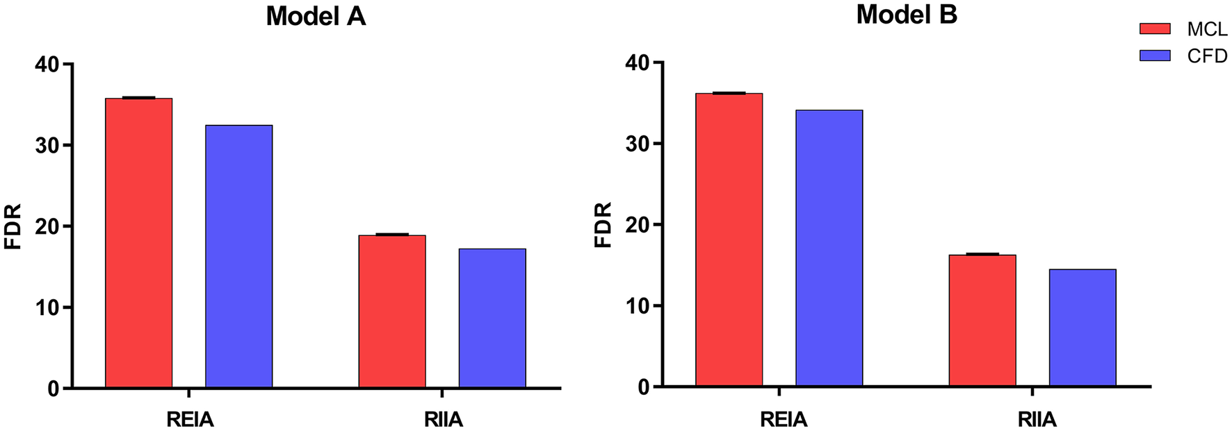 The FDR of the REIA and the RIIA in Model A and Model B attained by two methods under healthy resting conditions. Bar plots indicate the standard deviation. REIA, right external iliac artery; RIIA, right internal iliac artery; FDR, flow distribution rate.