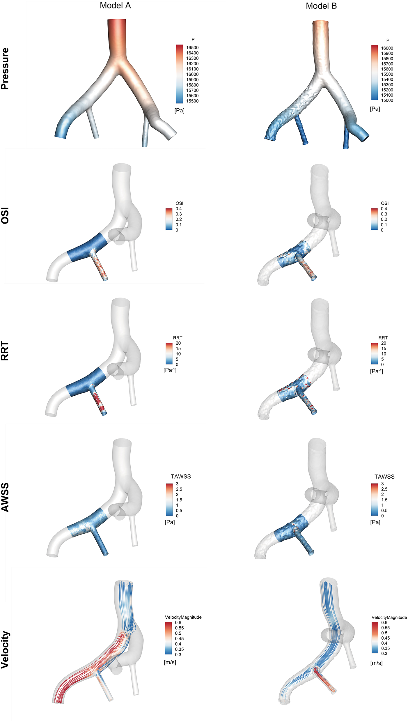 Data on the pressure and area flow rate were obtained at the intersected planes, which were 2 mm from the inlet and the four outlets. The detailed positions of the planes were shown in Supplementary Figure 1. Haemodynamic data, including flow pattern, time- averaged wall shear stress (TAWSS), oscillatory flow index (OSI), and relative residence time (RRT), were also analyzed for both models and for the region of interest around the RIIA.