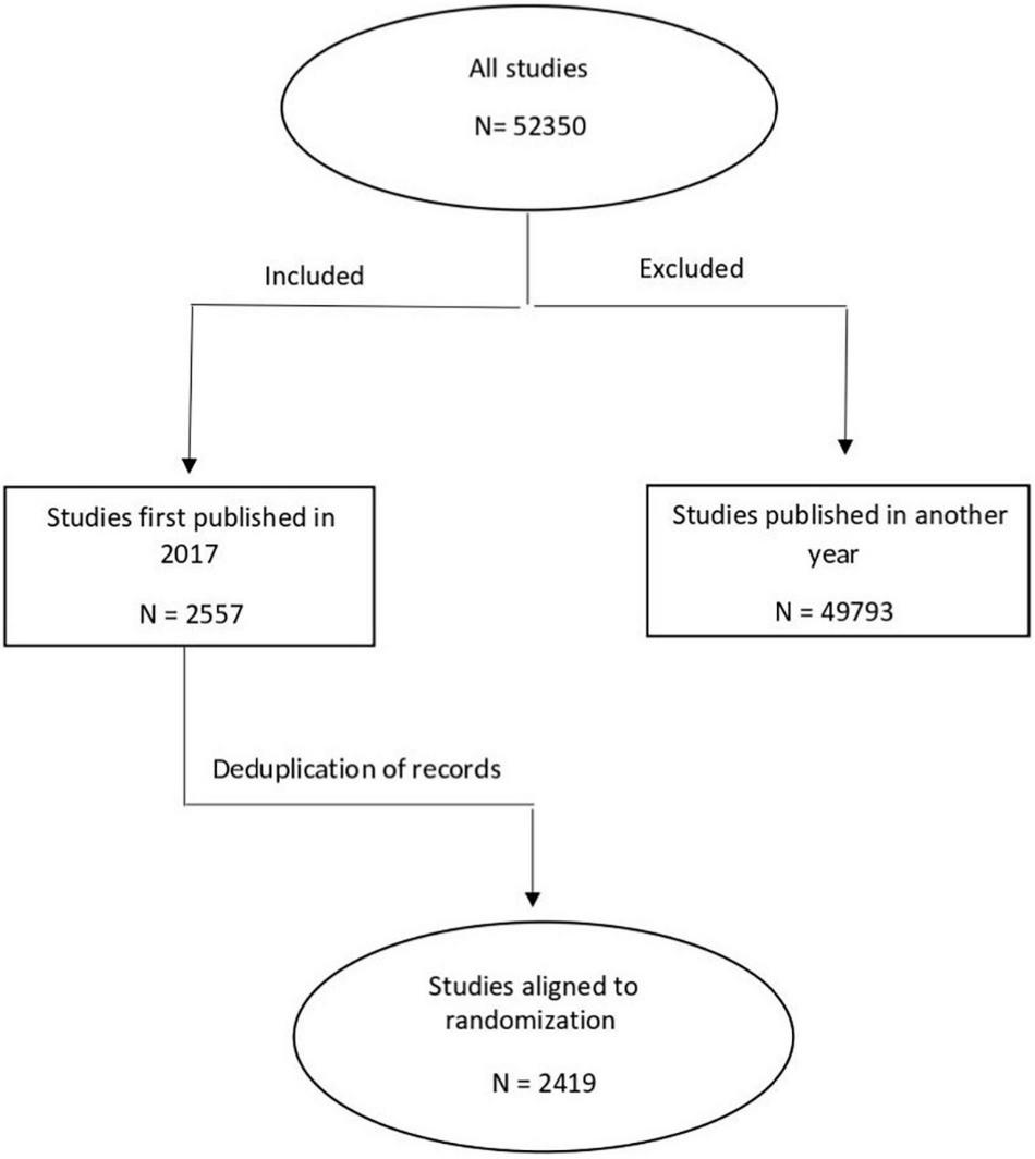We used the Cochrane CENTRAL Register of Controlled Trials to search for RCTs published in 2017 using subject headings and keywords related to adults (aged ≥ 18 years) and CVDs (such as, atherosclerosis, arrhythmia, cardiomyopathy, heart failure, hypertension, ischemic heart disease, heart attack, angina, sudden death, cardiac arrest, hypercholesterolemia, high blood pressure, CVD, ejection fraction, echocardiography, pericarditis, coronary artery disease, angioplasty, and angiography). The search and the screening of identified studies for eligibility were conducted by the first author (OB). Our search yielded a total of 2,556 studies (Supplementary File 1). Following deduplication, 2,419 studies underwent further analysis. Cochrane CENTRAL was the priority search source as it is the most comprehensive resource available of RCTs, containing publications from MEDLINE and EMBASE, as well as hand-search results, and gray literature (6, 11). Results of the search were randomly ordered in Excel, by the following method: after exporting the search result as an Excel file from Cochrane CENTRAL, we assigned a random number between 0 and 1 to each record using Excel’s random number generator, then reordered them from the smallest to the highest number (12). As a next step, we screened studies consecutively for eligibility, and the first 250 (∼10%) RCTs matching our pre-specified inclusion criteria were selected (Supplementary File 2). Trials were eligible for inclusion if they were published in the year 2017, were written in English, the described results of an RCT in the field of cardiovascular medicine, and included participants aged ≥ 18 years. Decision on the inclusion of a study was made after a careful consideration of the methodology in the full text.