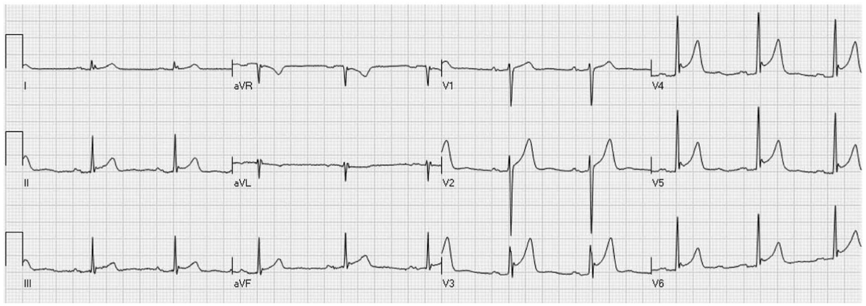 Standard ECG of a young (32 years old) healthy male subject showing a typical ST-segment elevation, with notched J wave in V4-V6 leads (with extension to V3) and, less accentuated, also in inferior leads.