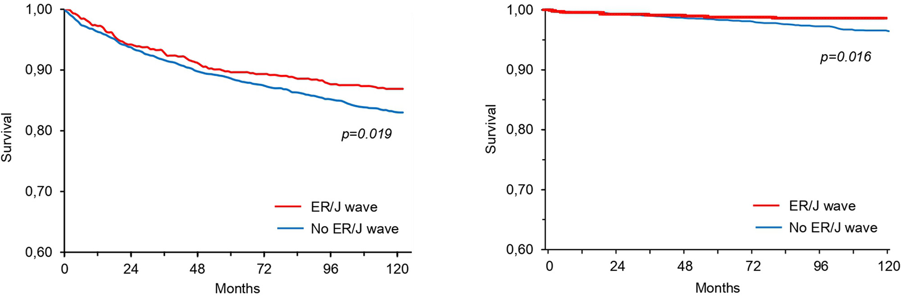 Survival curves for all-cause mortality (left) and cardiovascular mortality (right) in patients with or without ER/J wave at standard ECG (unadjusted p-values).