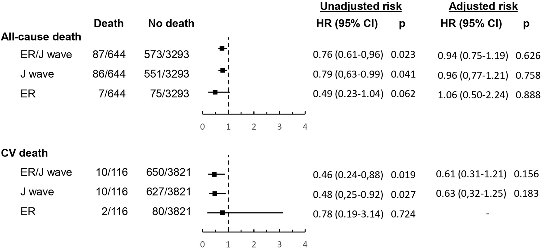 The survival curves of subjects with and without ER/J wave are shown in Figure 2, whereas the unadjusted and adjusted hazard ratios for all-cause and cardiovascular mortality are summarized in Figure 3. Deaths occurred in 87 subjects (13.2%) with and 557 (17%) without ER/J wave (p = 0.023). Death rate was lower in both subjects with ER (p = 0.062) and J wave (p = 0.041). However, in a multivariate analysis, the ER/J wave showed no significant association with death (Figure 3).
