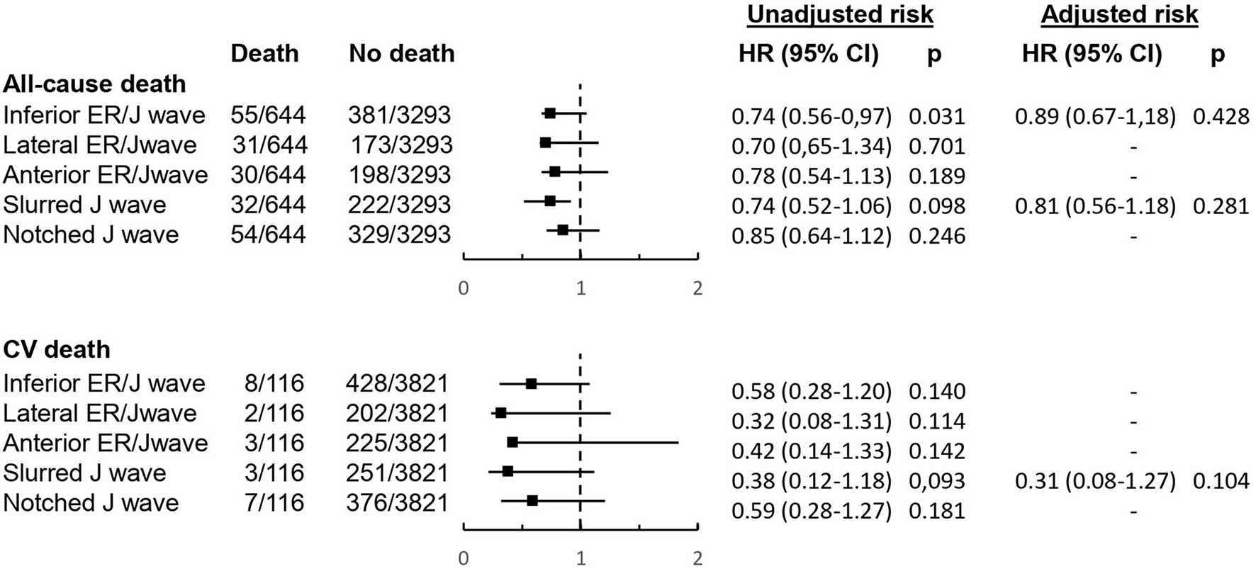 The assessment of ECG location (inferior, lateral, anterior) of ER/J wave and the type of J wave (slurred, notched) with both all-cause death and cardiovascular death was consistent with the main results, confirming the lack of any significant relation between ER/J wave with clinical outcome after adjustment for clinical variables (Figure 4). Also, among subjects with ER/J wave, maximal J wave and ST-segment elevation did not differ significantly between subjects with and those without fatal events (Table 3).