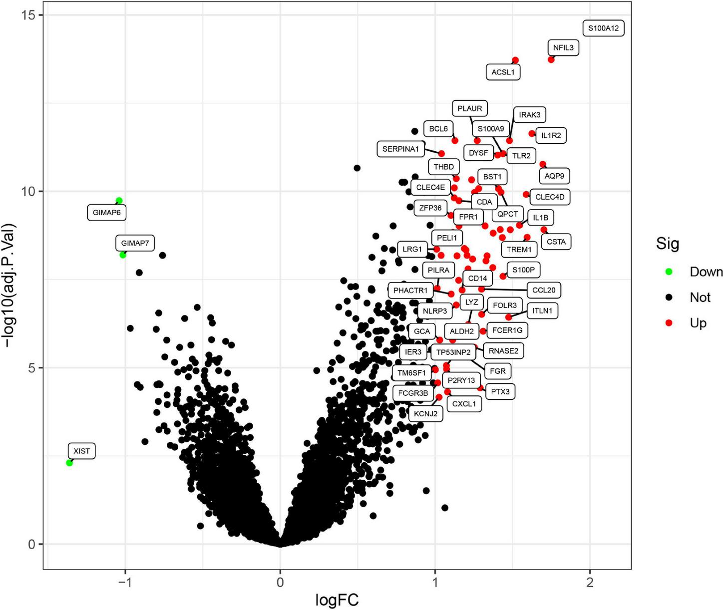 Differentially expressed genes (DEGs) between acute myocardial infarction samples and control ones. The red dots represent upregulated differential genes, the green dots represent differential downregulated genes, and the black dots represent genes without significant differences.