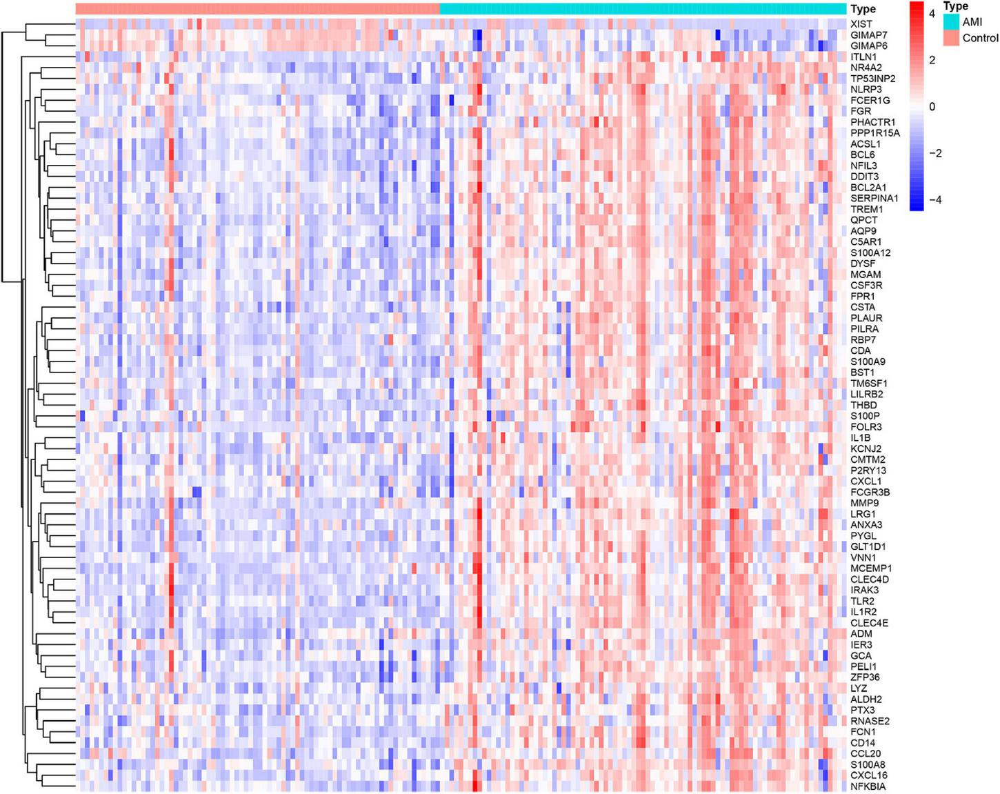Heatmap showing the expression changes in acute myocardial infarction and control samples. Red represents upregulated DEGs, blue represents downregulated DEGS, and the gradation of color represents the value of | log FC| (FC: fold change).