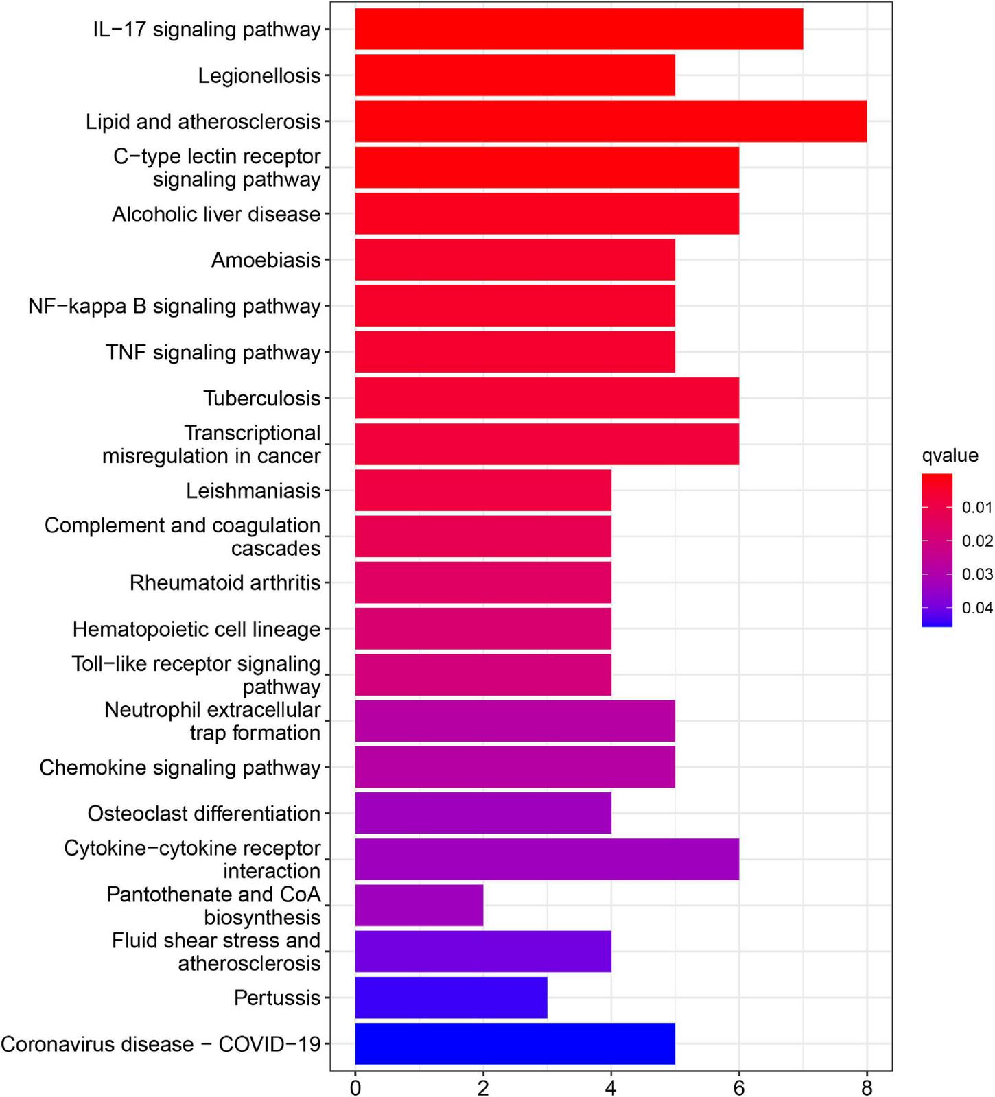 In addition, KEGG pathway analyses of DEGs are presented in Figure 4. The results shows the enriched pathways, primarily including immune system diseases (Legionellosis, Amoebiasis, and TB), immune-related pathways [IL-17 signaling pathways, C-type lectin receptor signaling pathway, nuclear factor-kappa B (NF-kappa B) signaling pathway, and tumor necrosis factor (TNF) signaling pathway], and transcriptional misregulation in cancer.
