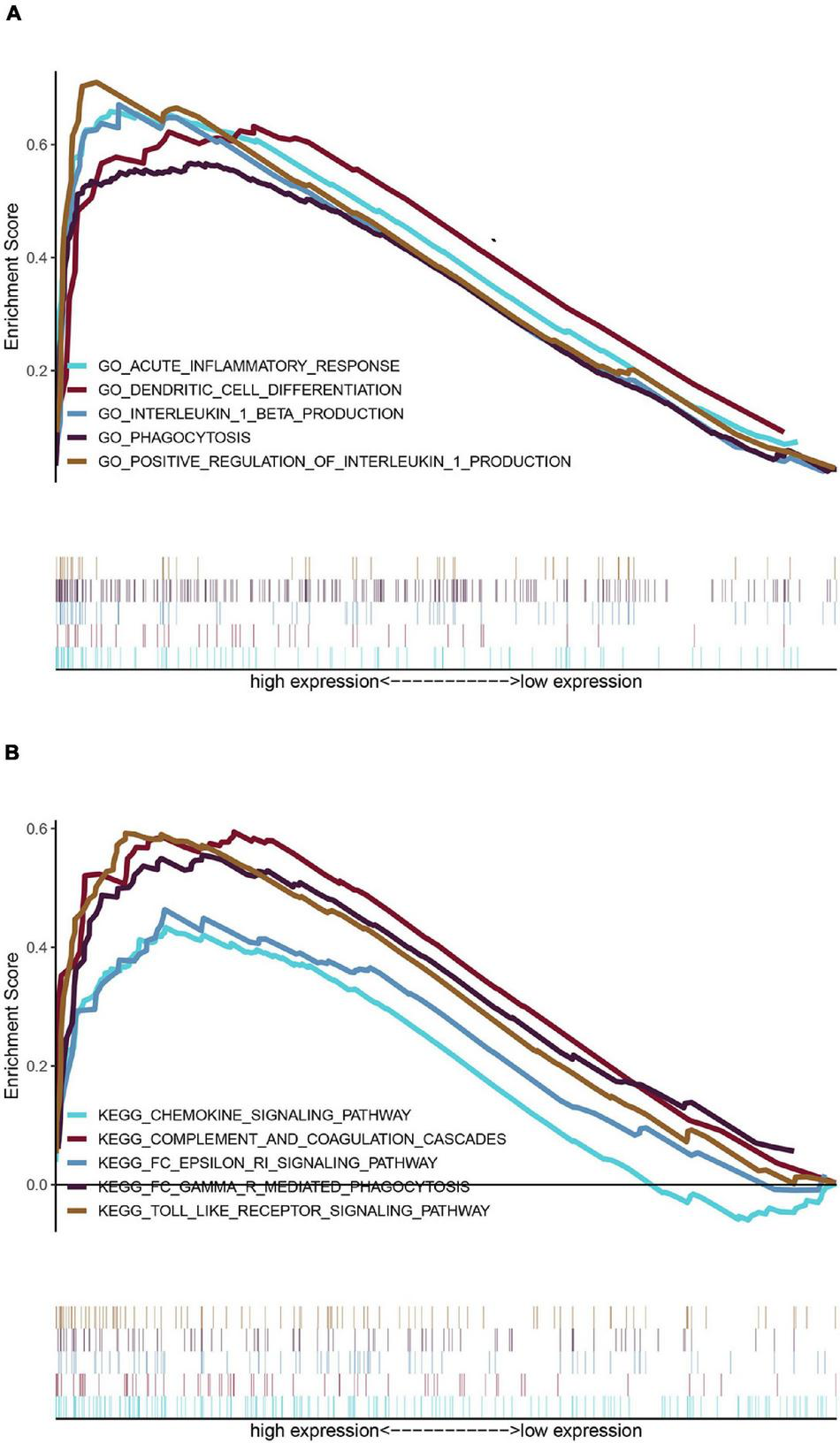 To explore the potential pathways and gene function associated with the immune system, GO and KEGG analyses were performed using GSEA. The GSEA results are similar to those of the GO and KEGG analyses based on DEGs (Tables 2, 3).