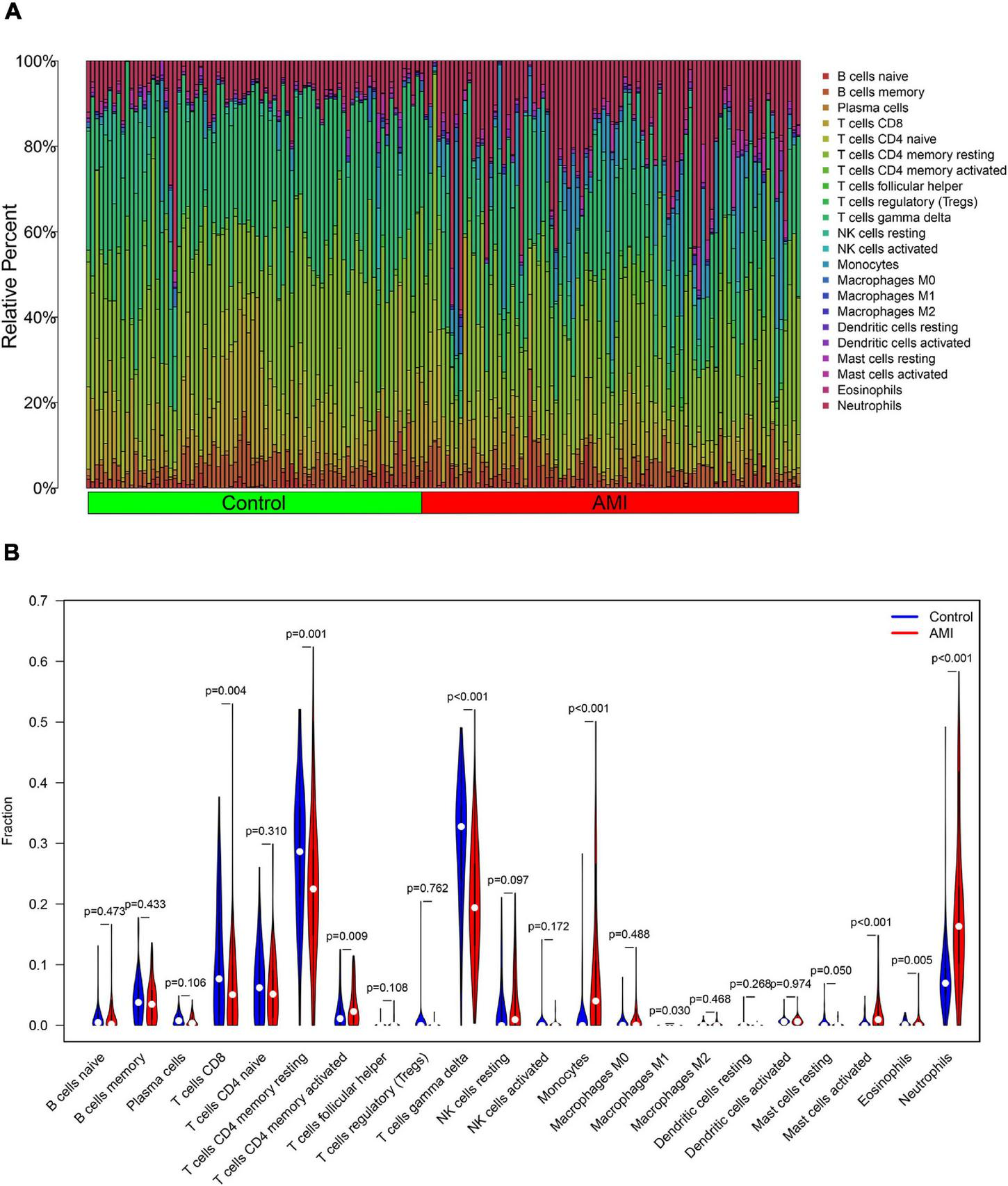 A bioinformatics algorithm called CIBERSORT was used to evaluate immune cell infiltrations. The leukocyte gene signature matrix LM22 with 1,000 permutations was used to calculate the putative abundance of immune cells (21). The data with a CIBERSORT value of p < 0.05 were filtered and retained for the following analysis. Thus, a matrix of immune cells fractions was generated. We used the R package “corrplot” to visualize a correlation analysis and 22 types of infiltrated immune cells. The visualization of the differences in immune cell infiltration between AMI and control samples was performed using the R package “vioplot.”