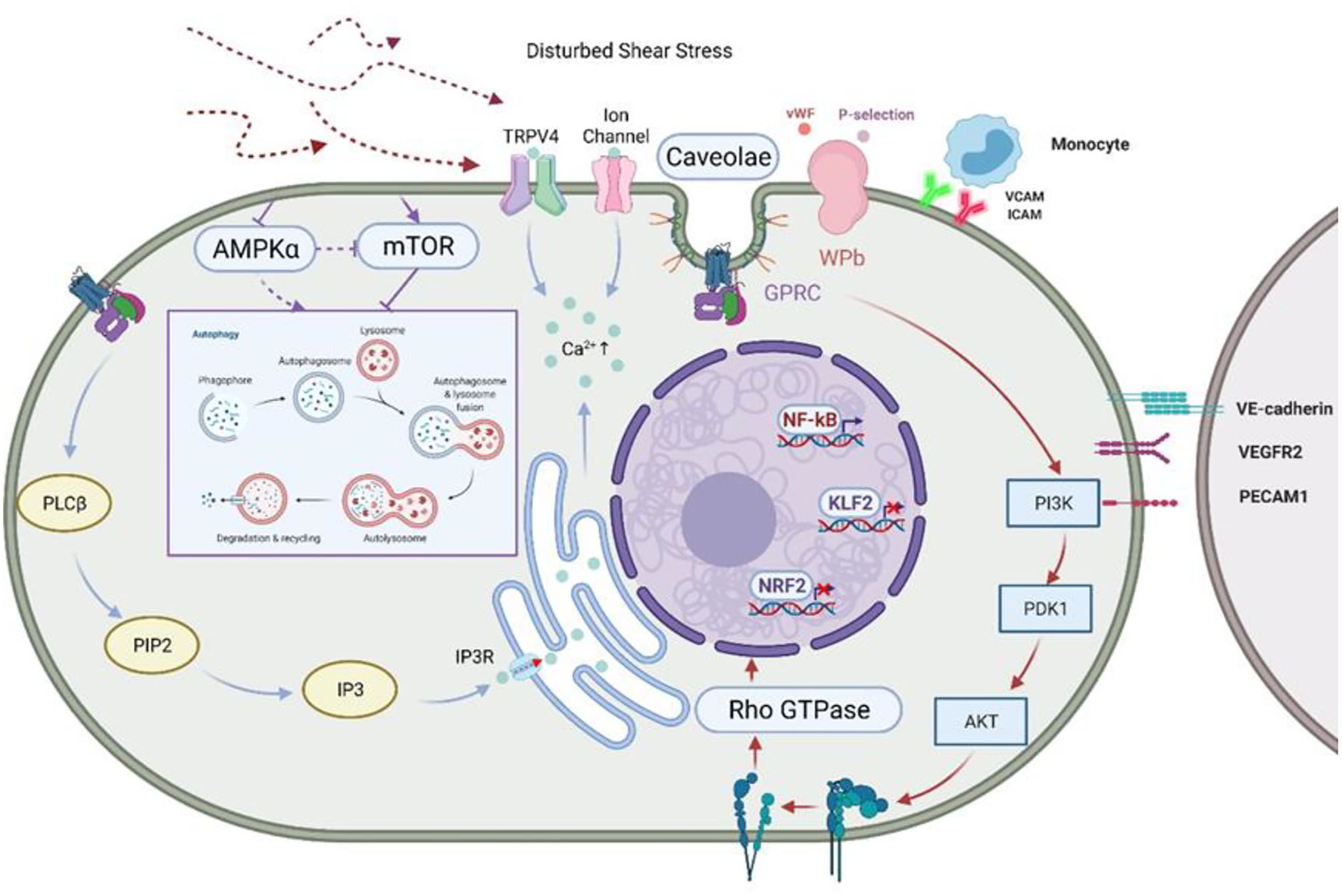 Disturbed shear stress activates ECs and inhibits autophagy. Shear stress inhibits AMPKα and activates mTOR, two classical “autophagy switches,” to inhibit autophagy. Glycocalyxin acts as the first pass-through sensor in the face of shear stress, converting mechanical signals into physiological signals, which are then passed on through ion channels, caveolae, and integrins, amongst others (42). Shear stress regulates endothelial cell behavior through GPCR and the mechano-sensing complex formed by VE-cadherin and VEGFR-2/VEGFR3, which stimulate PI3K/AKT signaling and activate integrins in an “outside-in” manner, leading to the cis-activation of GTPases and the regulation of the expression of various transcription factors (28). This leads to the cis-activation of GTPases and promotes the expression of transcription factors. In addition, stimulated VE-cadherin and VEGFR2/VEGFR3 form a mechano-sensing complex that transmits signals to neighboring cells. At the same time, Ca2+ is stored in the endoplasmic reticulum via IP3R by the PLCβ/PIP2/IP3 signaling pathway in response to perturbed shear stress. Activation of non-selective cation channels such as TRPV4 and leads to the influx of more Ca2+ and hyperpolarizes the membrane. At the same time, shear stress regulates platelet behavior by inducing the release of P-selectin and vWF from WPBs (46). AMPK, AMP-activated protein kinase; mTOR, mammalian target of rapamycin; GPCR, G protein-coupled receptors; VEGFR, vascular endothelial growth factor receptor; PI3K, phosphatidyl inositol 3 kinase; IP3R, inositol trisphosphate receptor; PLCβ, Phospholipase C Beta 3; PIP2, phosphati-dylinositol-4,5-bisphosphate; IP3, inositol triphosphate; TRPV4, transient receptor potential; , Ca2+-sensitive K channels; WPBs, Weibel-Palade bodies; vWF, von Willebrand factor.