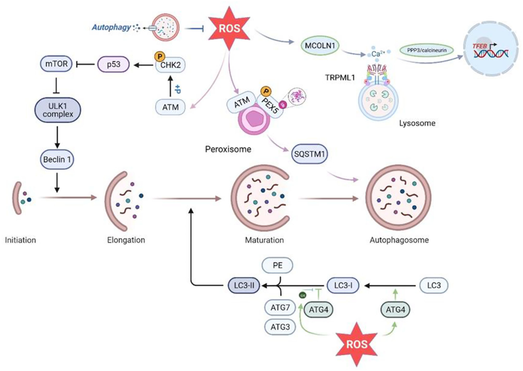 Effects of ROS on various aspects of autophagy. ROS promote autophagy initiation by activating ATM to phosphorylate Chk2 at Ser90/Ser93, which in turn inhibits mTOR. In addition, in the peroxisome, PEX5 is phosphorylated and ubiquitinated in an ATM-dependent manner activated by ROS, promoting autophagy by enhancing SQSTM recognition of the cargo (95). In addition, increased ROS inhibit ATG4-mediated LC3 delipidation and promote autophagic vesicle maturation. Higher levels of ROS lead to ATG4 oxidation and inhibit ATG4 deconjugation of LC3 to allow phagosome expansion and promote autophagic membrane formation. Increased intracellular ROS levels can directly activate Ca2+ channels in the lysosomal membrane (MCOLN1/TRPML1), inducing Ca2+ release and triggering PPP3/calcineurin-dependent TFEB nuclear translocation to promote autophagy. ROS, reactive oxygen species; ATM, ataxia-telangiectasia mutant; CHK2, cell cycle checkpoint kinase 2; PEX5, peroxisome import receptor; SQSTM1, sequestosome1; ATG, autophagy-related gene; PE, phosphatidylethanolamine; MCOLN1, mucolipin 1;TRPML1, Transient Receptor Potential Cation Channel Subfamily;PPP3, protein phosphatase 3;TFEB, transcription factor EB.