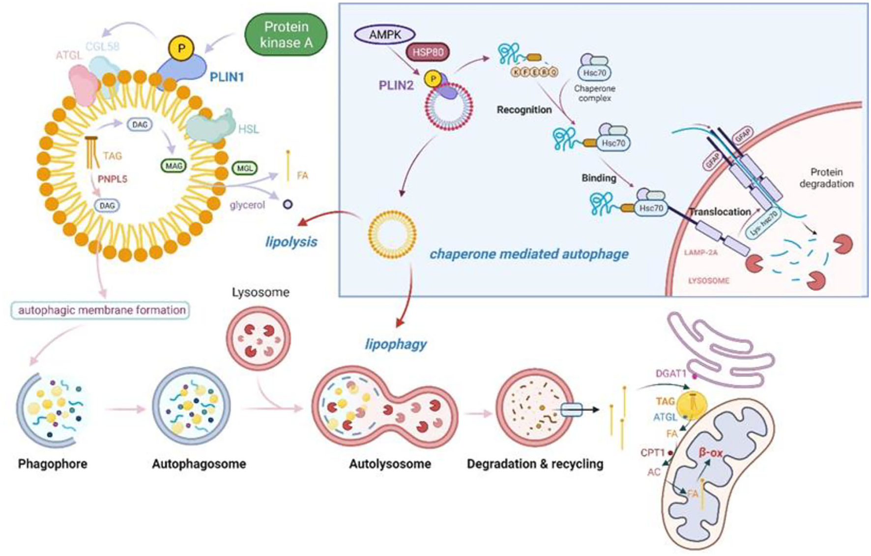 The process of LD degradation is not straightforward, and the LD surface is associated with hundreds of proteins that are implicated in both the metabolic modulation and lipid signaling activities of LDs. The most important are the five-member PLIN family proteins, PLIN1-5. PLIN2 and PLIN3 both contain the KFERQ chaperone-mediated autophagy recognition motif, which binds to the 70 kDa heat shock-associated protein (Hsc70) and directs LDs toward the lysosome, via another type of autophagy —chaperone-mediated autophagy (CMA)—for degradation (119).