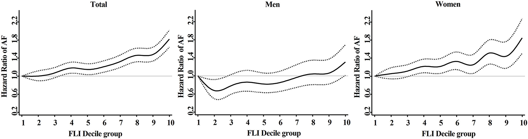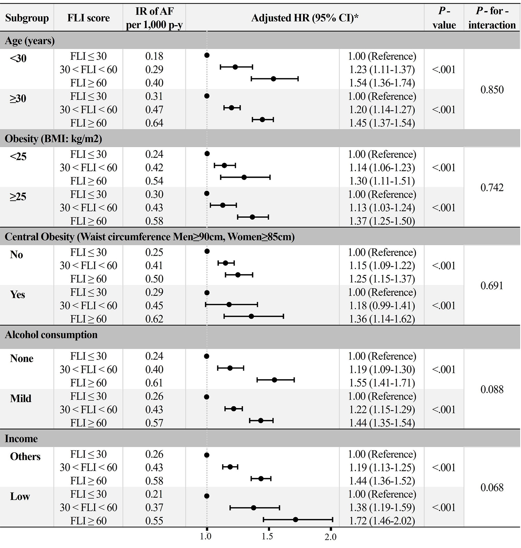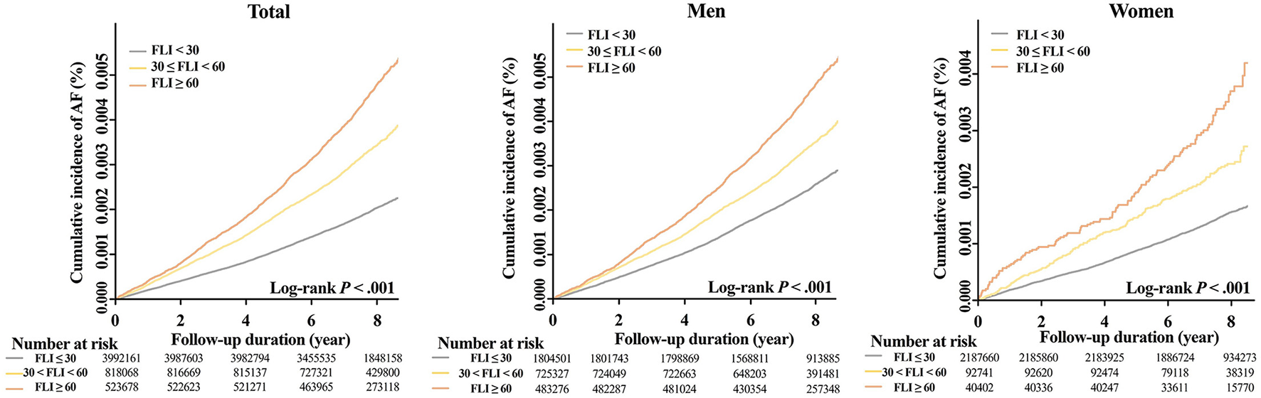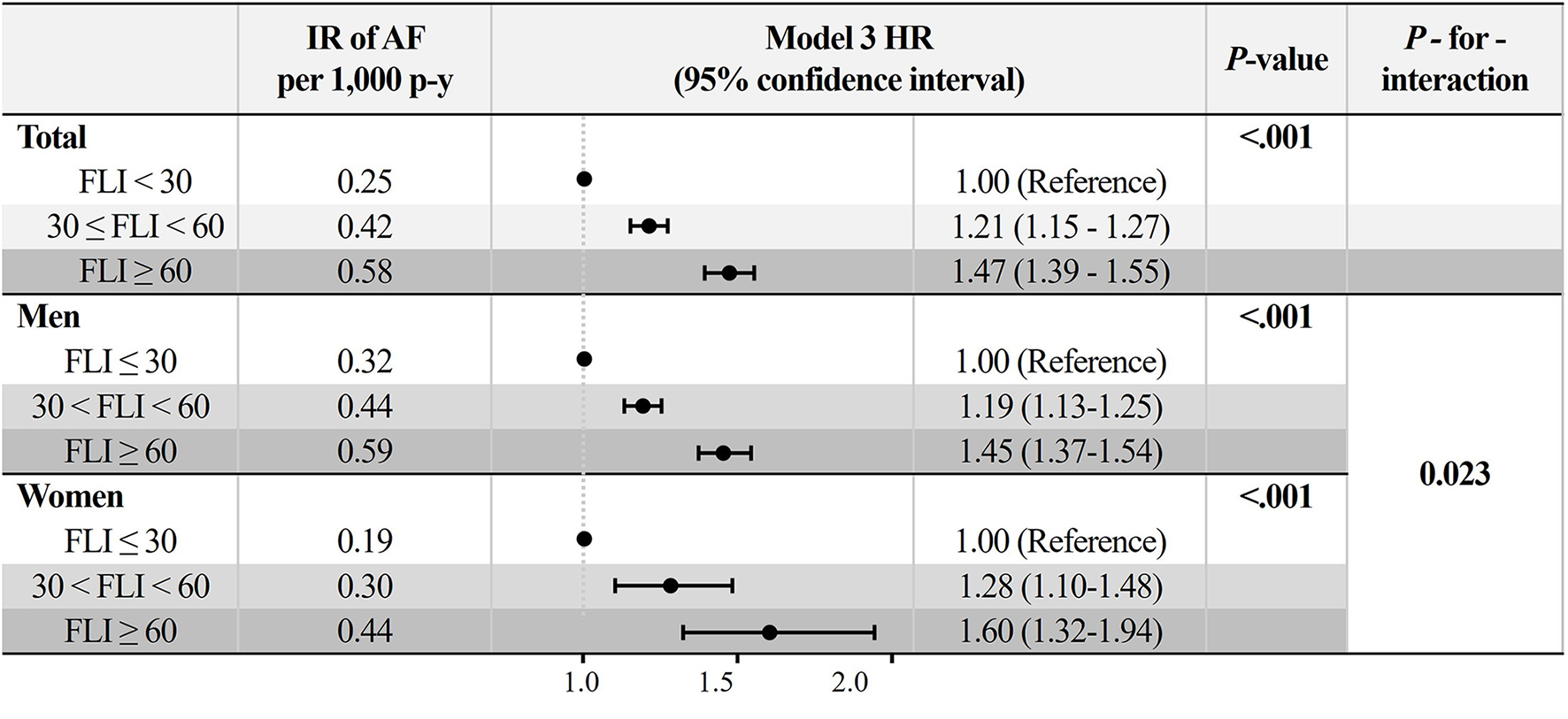 We included 5,333,907 subjects (mean age, 31 ± 5 years; men, 57%). During a mean follow-up of 7.4 ± 1.1 years, 12,096 patients had newly diagnosed AF (incidence rate 0.31 per 1,000 person-years). After adjustment, subjects with FLI 30 to <60 and FLI ≥60 showed a higher risk of AF compared to those with FLI <30 (hazard ratio [HR] 1.21, 95% confidence interval [CI, 1.15–1.27] and HR 1.47, 95% CI [1.39–1.55], p < 0.001, respectively). In women, the increased AF risk was accentuated in the higher FLI group than in the individuals with FLI <30, compared with men (p-for-interaction = 0.023). A higher incident AF risk in the higher FLI groups was consistently observed in various subgroups.