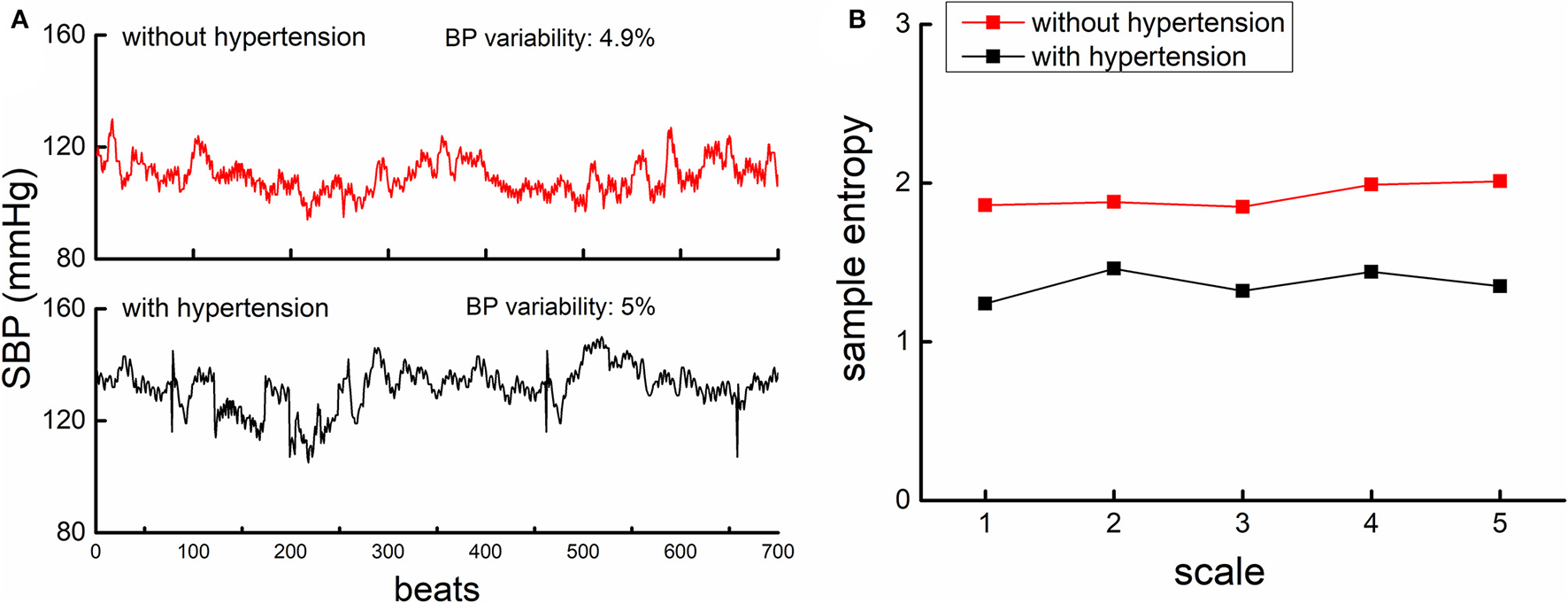 The beat-to-beat SBP series (A) and MSE curves (B) from one participant with hypertension (lower panel of A, black) and another participant without hypertension (upper panel of A, red). (A). An example of the beat-to-beat SBP series from one participant without hypertension (upper left panel) and from one participant with hypertension (lower left panel). Both participants had similar BP mean level and BP variability as displayed in the figure. (B) shows the MSE curve calculated from the SBP series of these two participants. The entropies of the participant with hypertension were lower than that of participants without, across all the five scales. This suggested that the complexity of SBP fluctuation was lower in hypertensive as compared to non-hypertensive, while the BP variability was similar.