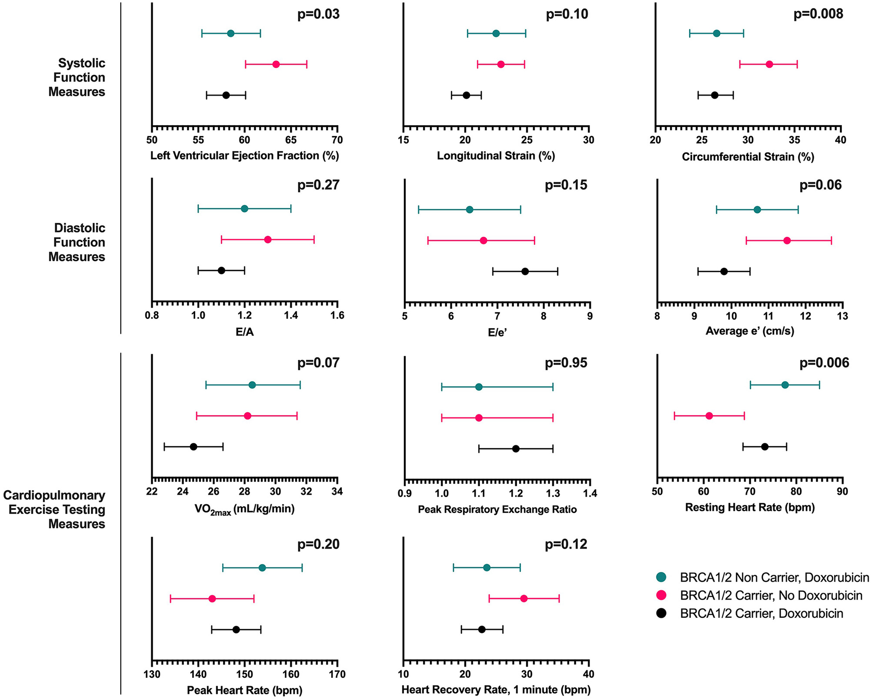 Age-adjusted marginal mean (95% Confidence Interval) estimates of echocardiography and cardiopulmonary exercise testing measures according to exposure group. The figure presents the age-adjusted marginal mean (95% confidence interval) estimates based on analysis of covariance for measures of systolic function, diastolic function and cardiopulmonary exercise testing according to exposure group including (a) BRCA1/2 mutation carriers exposed to doxorubicin, (b) BRCA1/2 mutation carriers not exposed to doxorubicin, and (c) BRCA1/2 mutation non-carriers exposed to doxorubicin. For longitudinal and circumferential strain, absolute values are presented, where by a higher value represents greater function.