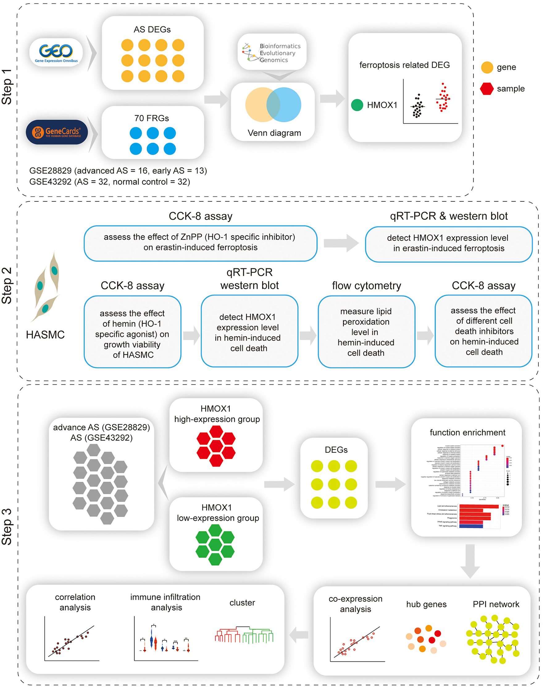 Flow chart of the study. Step 1: Identification of HMOX1 as the ferroptosis-related DEG in atherosclerosis. Step 2: Validating the pro-ferroptotic effect of HMOX1 in HASMCs. Step 3: Single-gene analysis of HMOX1. DEG, differentially expressed gene; HASMC, human aortic smooth muscle cell; AS, atherosclerosis.