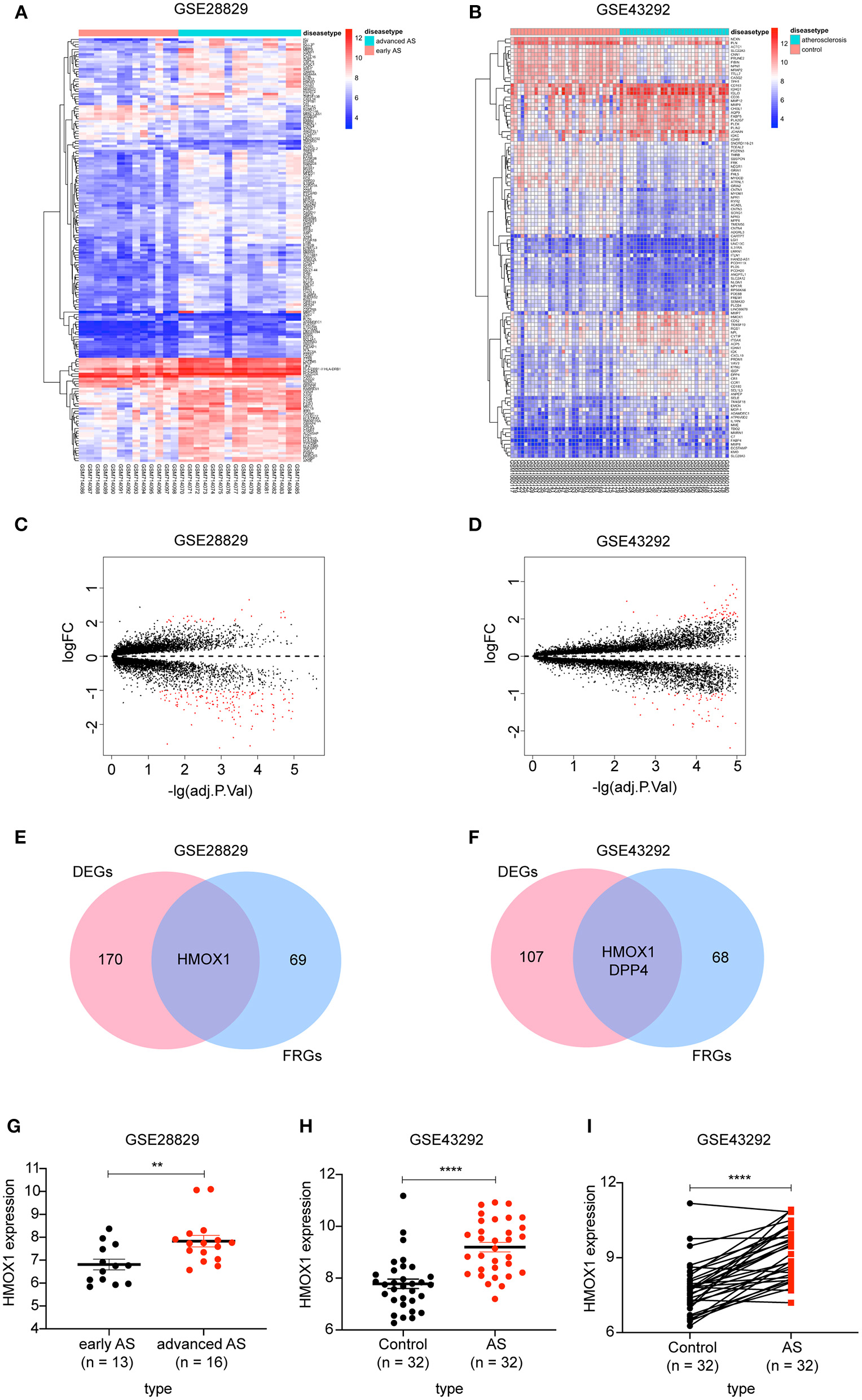 Identification of differential FRGs associated with atherosclerosis. Heatmaps showing DEGs in advanced atherosclerosis compared to early atherosclerosis in GSE28829 (A) and DEGs in atherosclerosis samples compared to samples of distant macroscopically intact tissue in GSE43292 (B). Volcano plots of DEGs in GSE28829 (C) and GSE43292 (D). Venn diagram showing that HMOX1 was the only FRG related to atherosclerosis resulting from the analysis of both GSE28829 (E) and GSE43292 (F) databases. The HMOX1 expression level in atherosclerotic plaques compared between paired and non-paired samples in GSE28829 (G) and GSE43292 (H,I). (**p < 0.01, ****p < 0.0001, compared between the groups by t-test) (FRG, ferroptosis-related gene).