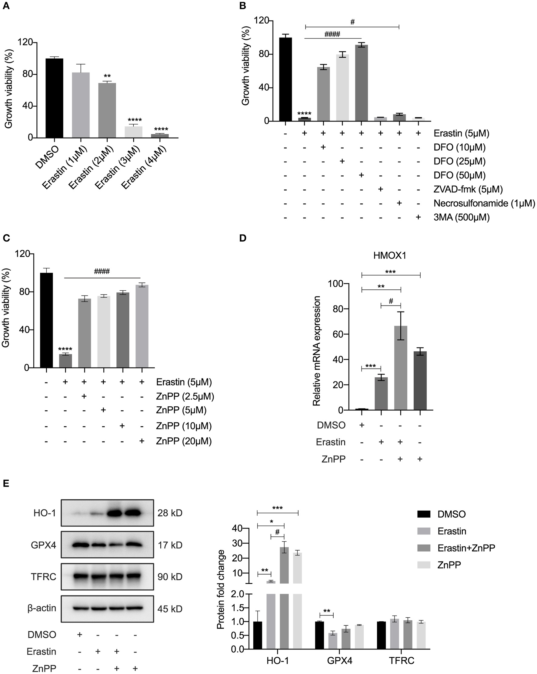 Inhibitor of HO-1 protects HASMCs from erastin-induced ferroptosis. Growth viability of HASMCs (A) in response to different doses of erastin for 24 h. Growth viability of HASMCs (B) after treatment with erastin (5 μM) in combination with different doses of DFO or different kinds of cell death inhibitors of zVAD-fmk (5 μM), necrosulfonamide (1 μM) and 3MA (500 μM) for 24 h. Growth viability of HASMCs (C) after treatment with erastin (5 μM) in combination with ZnPP, a classical HO-1 inhibitor. The mRNA content of HMOX1 (D) measured after treatment with DMSO (as control), erastin (3 μM), erastin (3 μM) combined with ZnPP (5 μM) or ZnPP (5 μM). Representative western blot images and quantitative analysis results (E) of HO-1, GPX4 and TFRC proteins after treatment with DMSO (as control), erastin (3 μM), erastin (3 μM) combined with ZnPP (5 μM) or ZnPP (5 μM). (The error bars represent standard error of mean from three replicates. #p < 0.05, ####p < 0.0001, *p < 0.05, **p < 0.01, ***p < 0.001, ****p < 0.0001, compared between the groups by t-test).