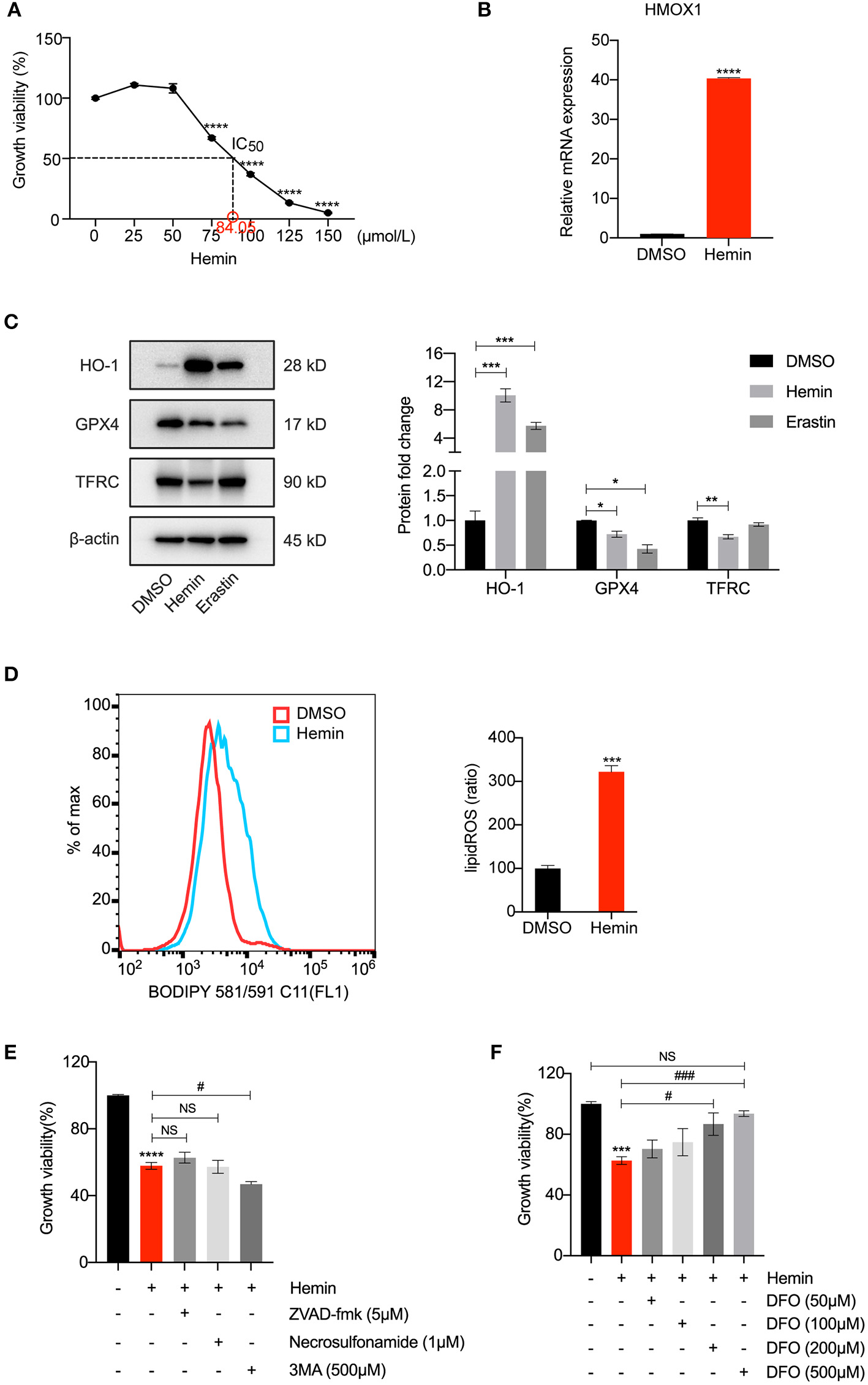 HMOX1 overexpression triggered by hemin leads to ferroptosis of HASMCs. Growth viability of HASMCs (A) in response to different doses of hemin for 24 h. The mRNA content of HMOX1 (B) detected by qRT-PCR after treatment with hemin (85 μM). Representative western blot images and quantitative analysis results (C) of HO-1, GPX4 and TFRC proteins after treatment with DMSO (as negative control), hemin (85 μM), and erastin (3 μM, as positive control). Lipid peroxidation production levels (D) detected by BODIPY 581/591 C11 stain (the ratio of lipid ROS was normalized to the blank group) after treatment with hemin (85 μM). Growth viability of HASMCs (E) after treatment with hemin (85 μM) in combination with different kinds of cell death inhibitors of zVAD-fmk (5 μM), necrosulfonamide (1 μM) and 3MA (500 μM) for 24 h. Growth viability of HASMCs (F) after treatment with hemin (85 μM) in combination with different doses of DFO. (The error bars represent standard error of mean from three replicates. NS means no significance, #p < 0.05, ###p < 0.001, *p < 0.05, **p < 0.01, ***p < 0.001, ****p < 0.0001, compared between the groups by t-test).