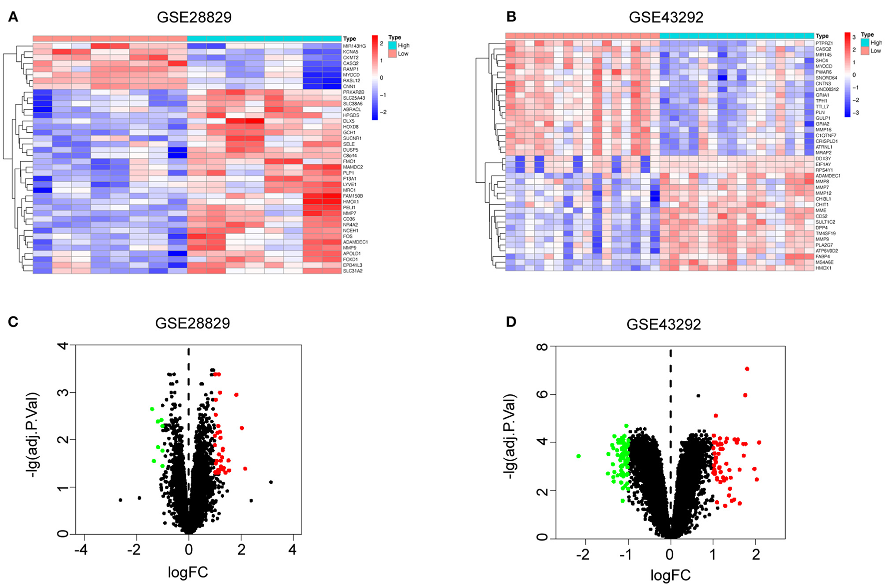 Single-gene analysis of HMOX1 in atherosclerotic plaques. Heatmaps showing DEGs in HMOX1 high-expression group compared to HMOX1 low-expression group in GSE28829 (A) and GSE43292 (B). Volcano plots of DEGs in HMOX1 high-expression group compared to HMOX1 low-expression group in GSE28829 (C) and GSE43292 (D).