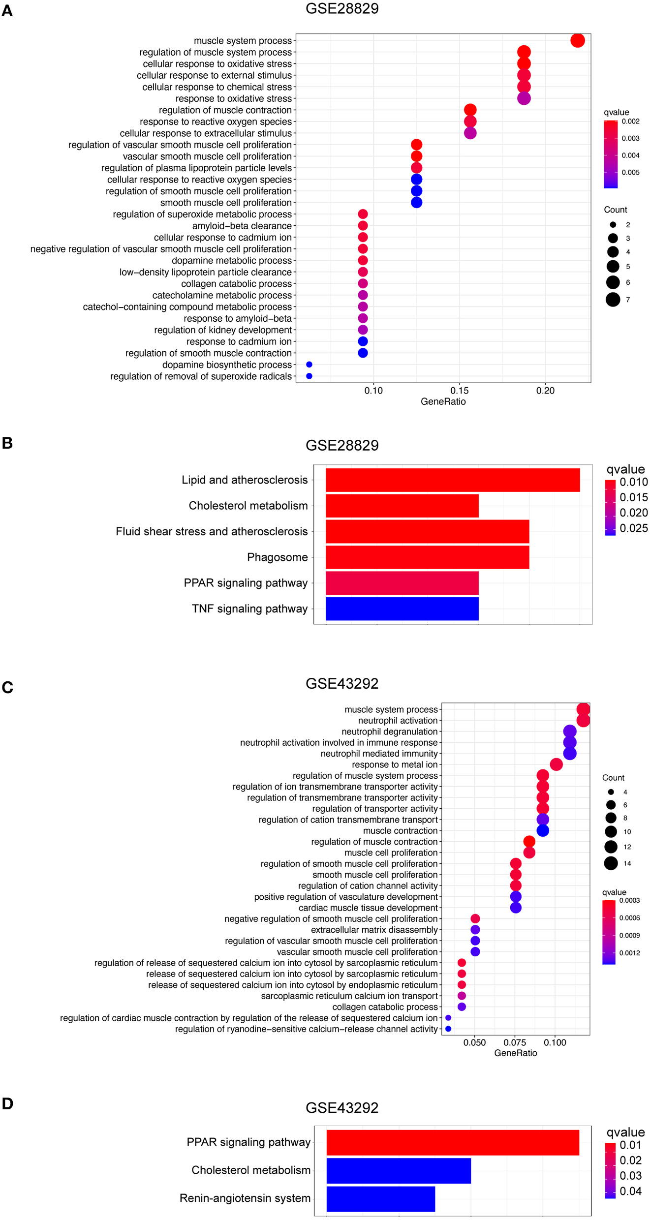Based on the evidence mentioned above, we went through a single-gene analysis of HMOX1. We divided samples of advanced atherosclerotic plaques in GSE28829 and atherosclerotic plaques in GSE43292 into HMOX1 high-expression group and HMOX1 low-expression group. Heatmaps and volcano plots showed 40 DEGs with the maximum absolute value of log2FoldChange (Figures 5A–D). GO and KEGG analysis of DEGs were performed to predict HMOX1 related cell metabolism and molecular interactions among genes. GO analysis contains three domains: biological process (BP), cellular component (CC) and molecular function (MF) (36). The top 30 enriched GO terms of GSE28829 were listed in Figure 6A. The most significant GO terms were about muscle system process, cellular response to oxidative, external stimulus, chemical stress and reactive oxygen species (ROS), etc. In addition, we also found that DEGs were significantly enriched in the pathway of the regulation of vascular smooth muscle cell proliferation, which indicated that HMOX1 expression was essential to biological changes of VSMCs. The KEGG result of GSE28829 listed in Figure 6B showed that DEGs were primarily enriched in lipid and atherosclerosis, cholesterol metabolism, fluid shear stress and atherosclerosis, phagosome, PPAR signaling pathway and TNF signaling pathway, respectively. Likewise, GO analysis of GSE43292 also found that many DEGs were enriched in muscle system process and vascular smooth muscle cell proliferation regulation. Some other GO terms, such as neutrophil activation in immune response and response to metal ion, were significant (Figure 6C). PPAR signaling pathway, cholesterol metabolism and renin-angiotensin system which have a tight connection with the development of atherosclerosis, were found significant and listed in Figure 6D.