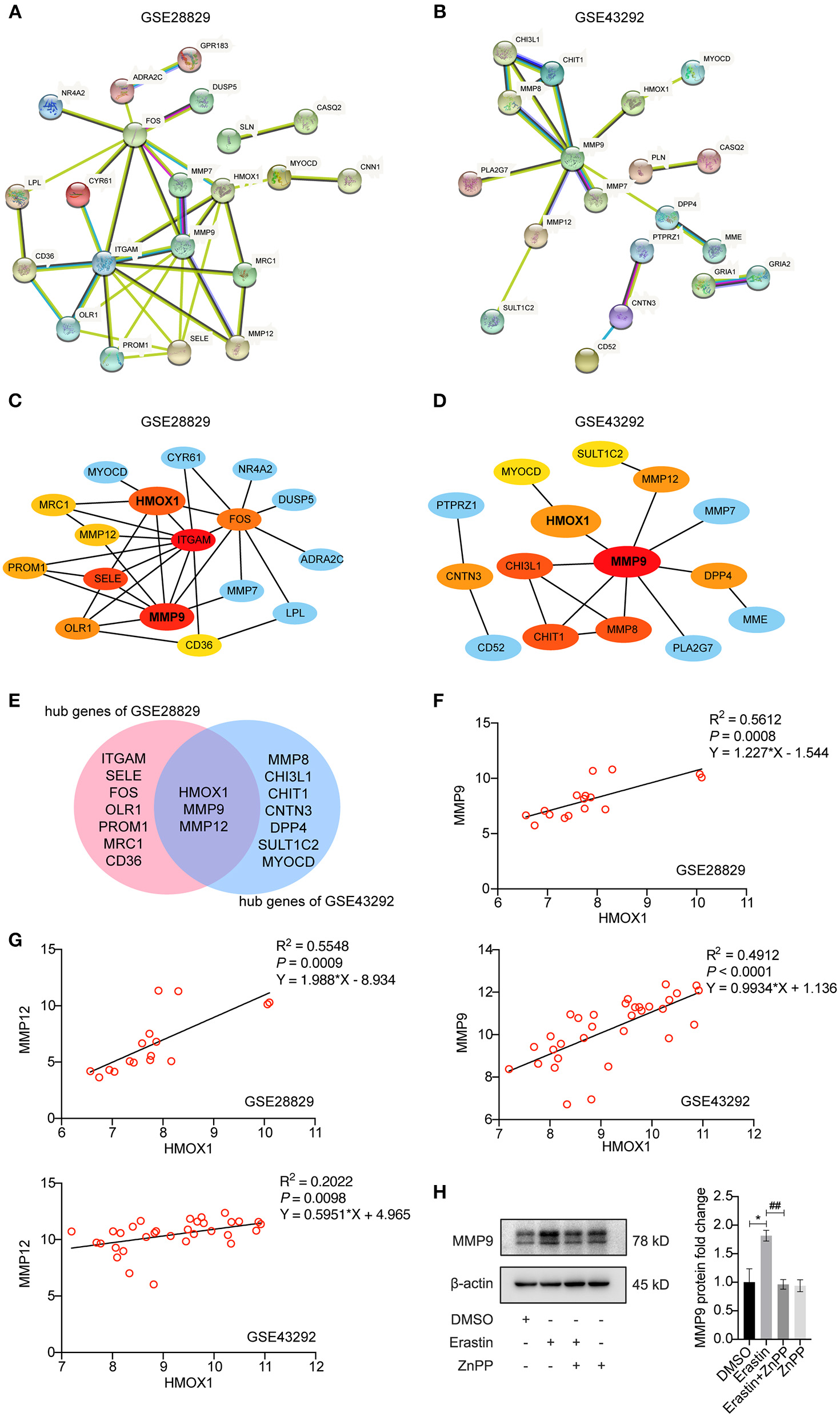 Analysis of protein-protein interaction (PPI) of DEGs in HMOX1 high- and low-expression groups. The PPI networks of DEGs identified between HMOX1 high-expression group and HMOX1 low-expression group in GSE28829 (A) and GSE43292 (B). The hub genes identified from the PPI networks (C,D). Venn diagram showing that HMOX1, MMP9 and MMP12 were hub genes (E). Correlation between HMOX1 and MMP9 as well as MMP12 (F,G). Representative western blot images and quantitative analysis results (H) of MMP9 after treatment with DMSO (as control), erastin (3 μM), erastin (3 μM) combined with ZnPP (5 μM) or ZnPP (5 μM). (The error bars represent standard error of mean from three replicates. ##p < 0.01, *p < 0.05, compared between the groups by t-test).