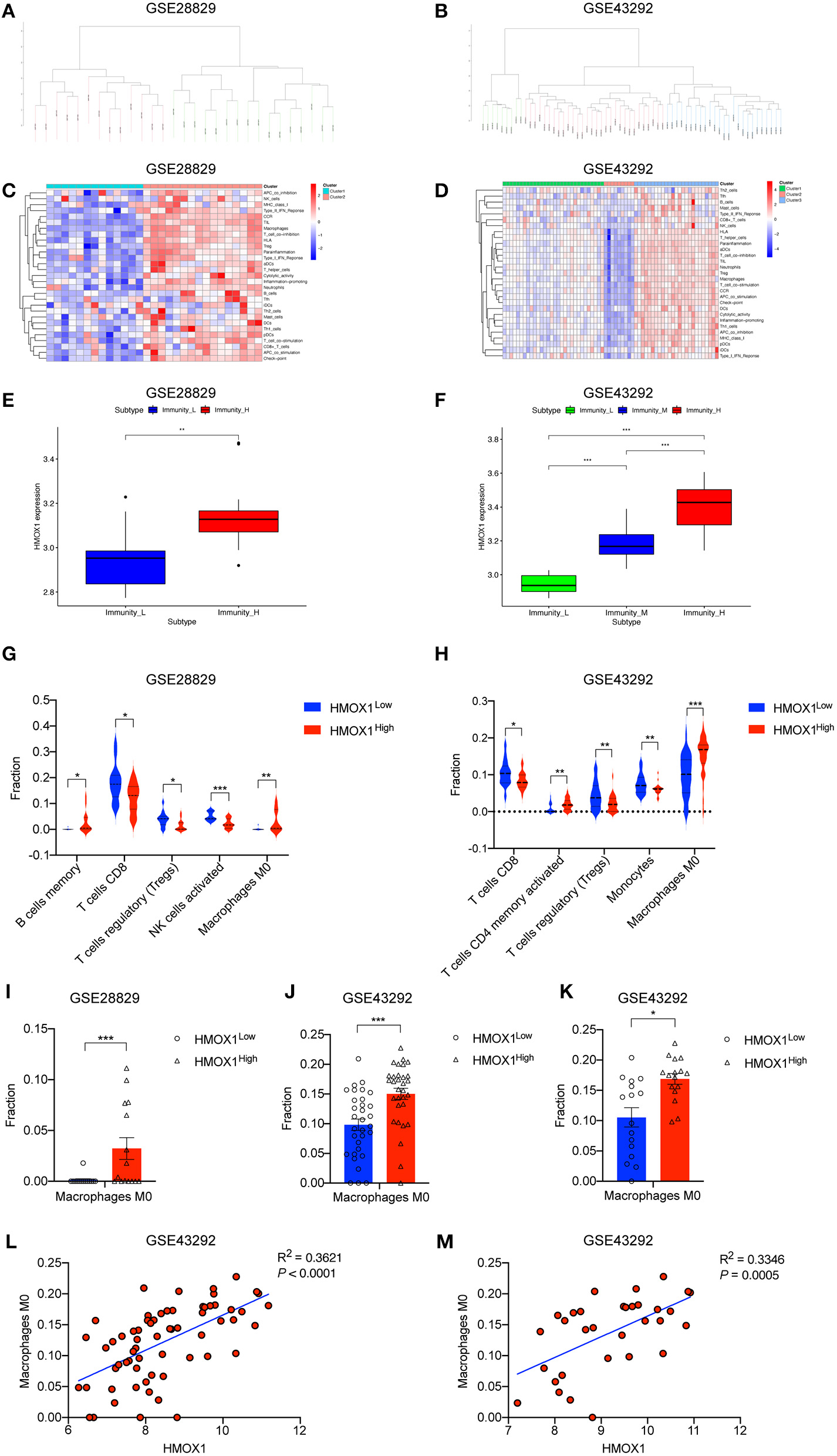 ssGSEA analysis showing high-expression of HMOX1 was related to a stronger immune response and macrophage infiltration. Samples in GSE28829 and GSE43292 clustering by immune scores (A,B). Heatmaps of different immune subtypes based on ssGSEA scores for 29 immune gene sets (C,D). HMOX1 expression levels among different immune subtypes (E,F). Differences in the levels of immune cells (memory B cells, CD8+ T cells, regulatory T cells (Tregs), activated NK cells, M0 macrophages, activated memory CD4+ T cells, and Monocytes) among the HMOX1 high- and low-expression groups (G,H). Different M0 macrophages infiltration levels among the HMOX1 high- and low-expression groups [(I) analysis of all atherosclerosis samples in GSE28829; (J) analysis of all 64 samples in GSE43292; (K) analysis of 32 atherosclerosis samples in GSE43292). Correlation analysis between HMOX1 expression and M0 macrophage levels among all 64 samples (L) and 32 atherosclerosis samples (M) in GSE43292. (*p < 0.05, **p < 0.01, ***p < 0.001, compared between the groups by t-test).