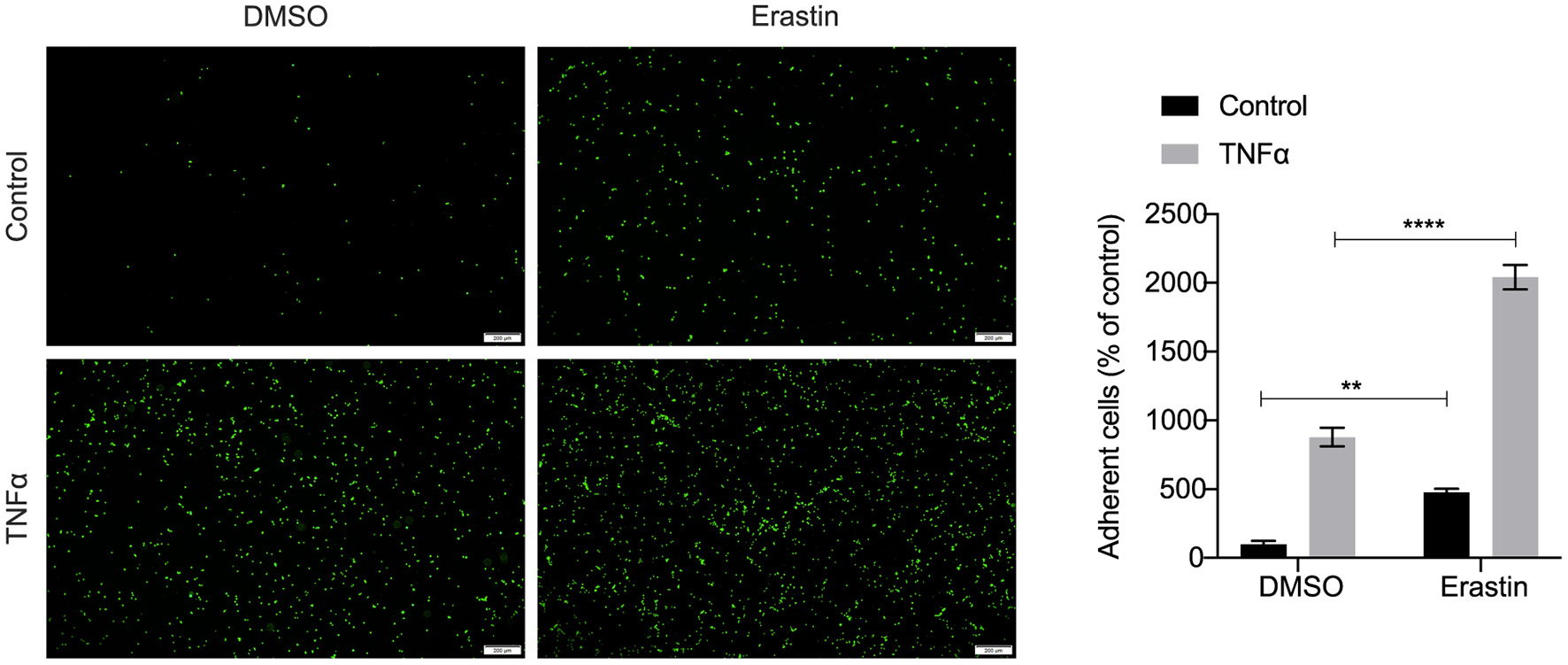 Representative pictures of the adhesion of fluorescently labeled THP-1 cells on HASMC monolayers. HASMCs were treated with DMSO (as control) or erastin (2 μM) for 24 h, then stimulated with or without TNFα (10 ng/ml) for 6 h and THP-1 cells, labeled with a fluorescent dye Calcein AM (5 μM), were added to HASMCs. After adhering, THP-1 cells bound to HASMCs were photographed by fluorescent microscopy and counted using Image J software. (The error bars represent standard error of mean from five images per well. **p < 0.01, ****p < 0.0001, compared between the groups by t-test).