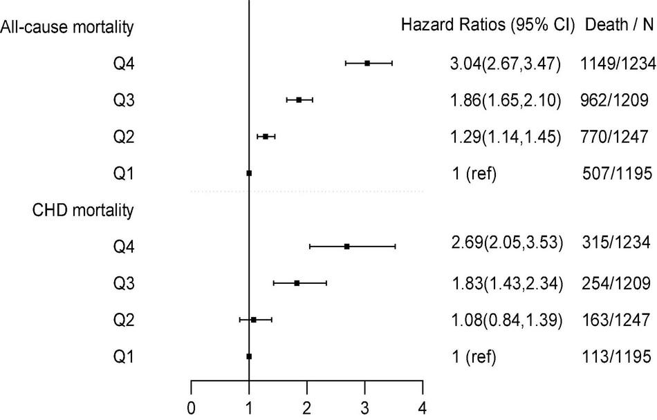 Table 2 and Figure 1 show Cox proportional HRs and 95% CIs for all-cause and CHD mortality by quartiles of B2M. B2M was strongly associated with all-cause mortality (HR for Q4 vs. Q1 5.90; 95% CI: 5.31–6.57; p-trend < 0.001) in the unadjusted model. After further adjustment for sex, race/ethnicity, marital status, BMI, alcohol, smoking, GFR, C-reactive protein, LDL cholesterol, HDL cholesterol, serum globulin, fasting glucose, and HEI-2010, B2M was still significantly associated with all-cause mortality in model 2. In multivariable model 3, a positive linear association between B2M and all-cause mortality was observed (HR for Q4 vs. Q1 3.04; 95% CI: 2.67–3.47; p-trend < 0.001). A similar association was observed for CHD mortality. In the unadjusted model, B2M was strongly correlated with CHD mortality (HR for Q4 vs. Q1 6.75; 95% CI: 5.42–8.41; p-trend < 0.001). In multivariable adjustment model 3, we observed a positive linear association between B2M and CHD mortality (HR for Q4 vs. Q1 2.69; 95% CI: 2.05–3.53; p-trend < 0.001). In addition, a dose-response relationship between B2M and CHD and all-cause mortality was observed, and deaths increased with the increase in B2M concentration.