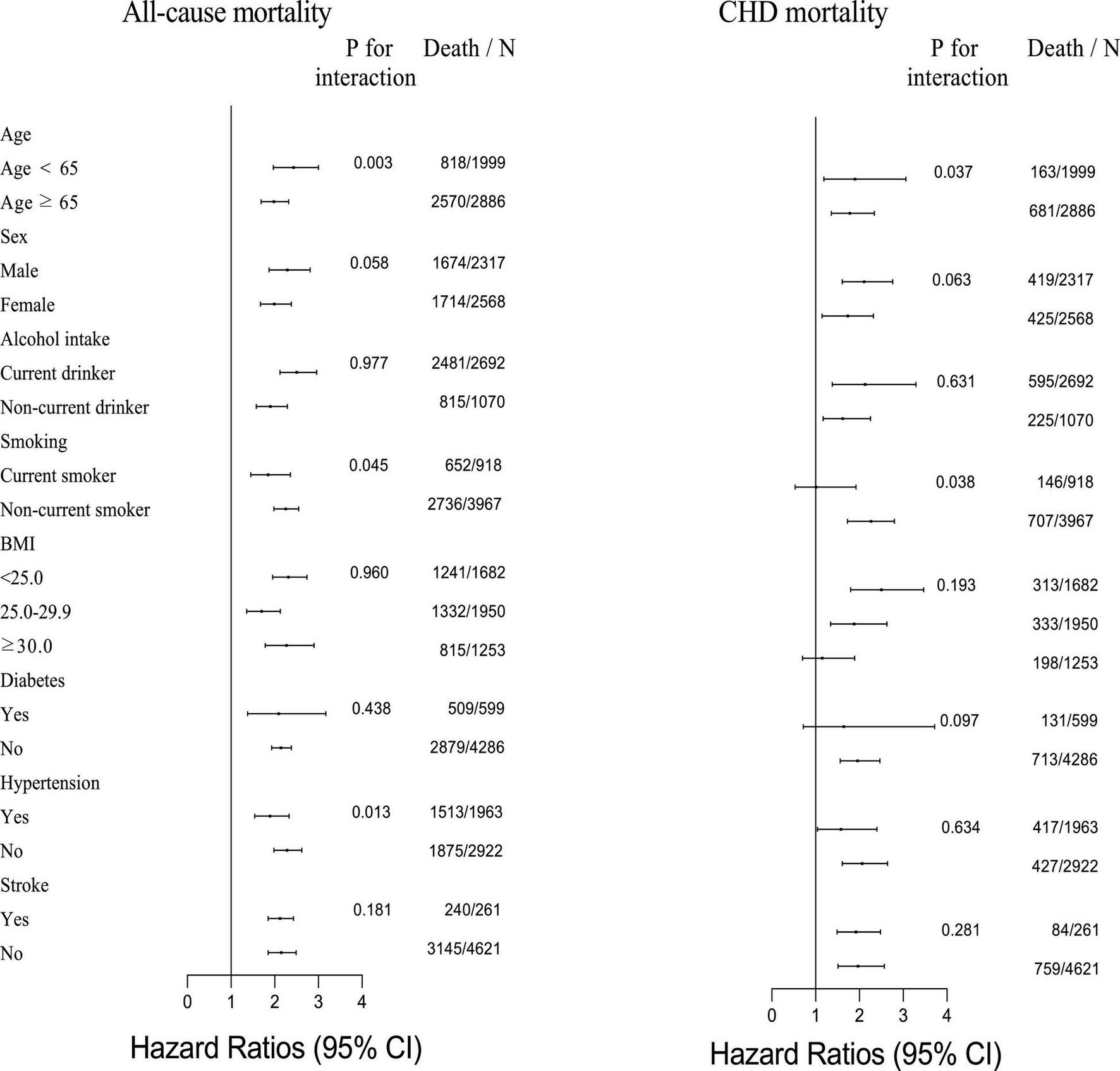 Finally, we also conducted sensitivity analyses to evaluate reverse causation bias in the associations by excluding the following: (1) deaths during the first 2 years of follow-up; (2) participants with histories of disease, including diabetes, hypertension, or stroke; (3) participants with GFR < 90 ml/min 1.73 m2. Statistical analyses were performed in SAS software version 9.4 and GraphPad Prism 8 software. Two-sided p-values < 0.05 were considered statistically significant.