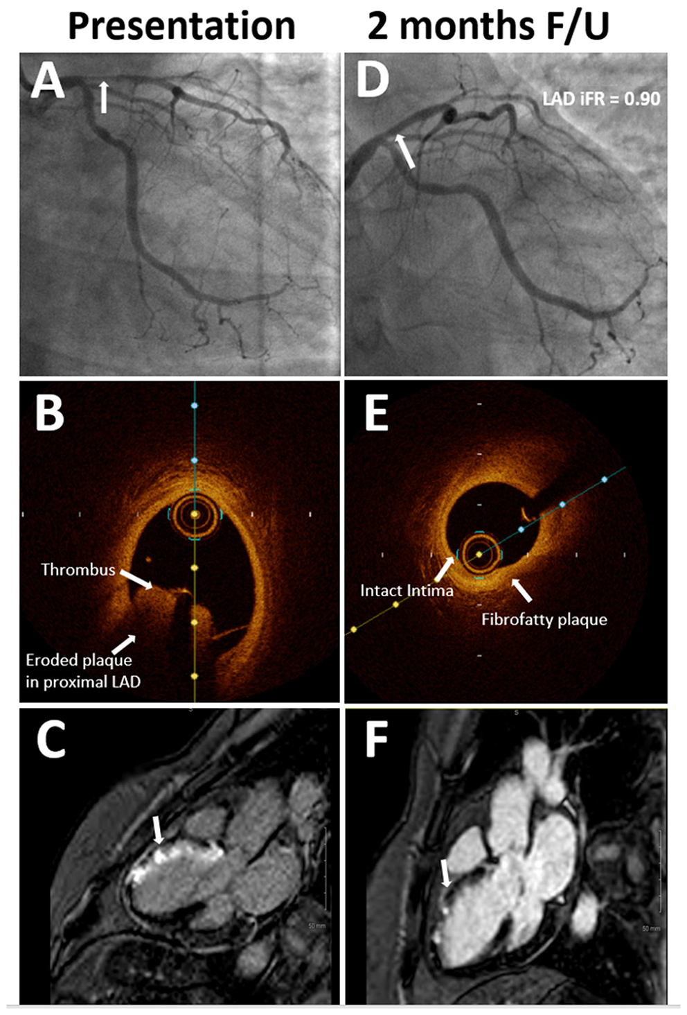 (A) Coronary angiography at presentation showing 80% stenosis (arrow) in proximal left anterior descending (LAD) with TIMI flow grade 2. (B) Optical coherence tomography (OCT) imaging at presentation showing significant thrombotic burden (arrow) and eroded plaque in the LAD. (C) Late gadolinium enhancement on cardiac magnetic resonance (CMR) imaging at presentation (arrow) consistent with LAD territory infarct. (D) Coronary angiography at 2-month follow-up showing non-obstructive stenosis (arrow) in proximal LAD. (E) OCT imaging at 2-month follow-up shows stable plaque in proximal LAD. (F) Non-transmural infarct was seen on the follow-up CMR imaging, which was done 6 weeks after the first presentation.