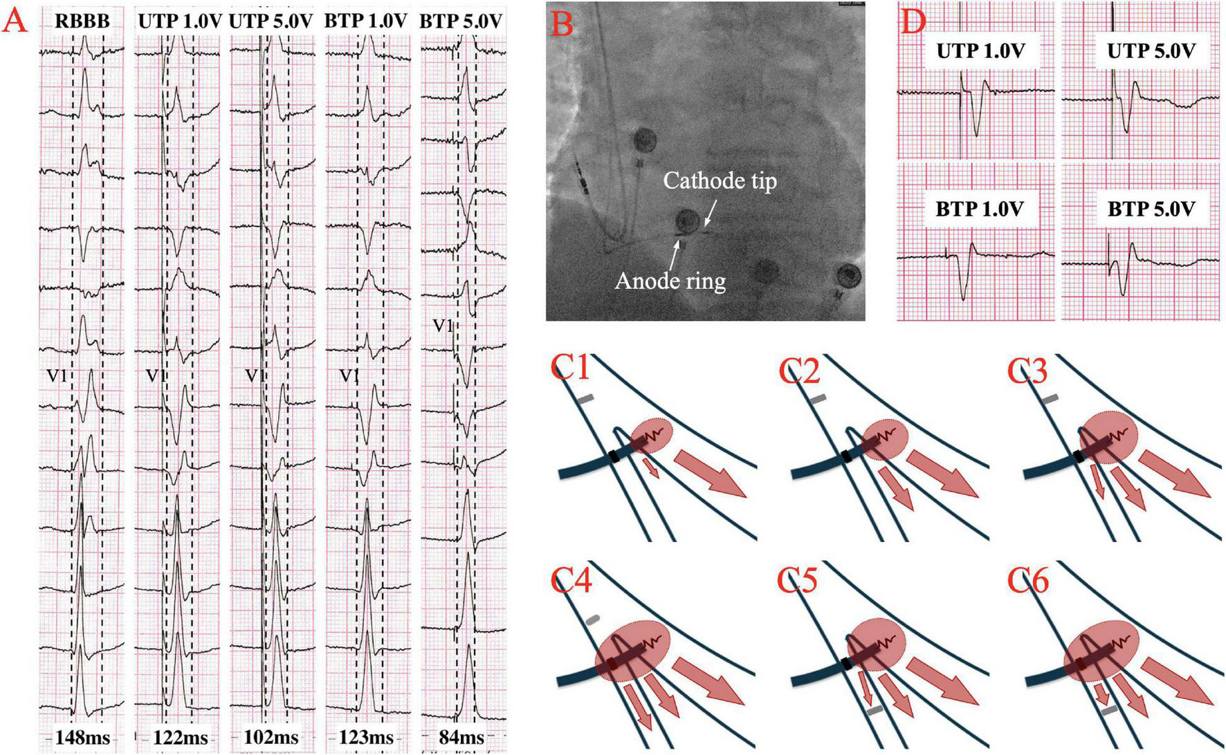 The paced QRS complex with BTP is differs from that with UTP, probably due to anodal capture during bipolar pacing (37). RV anodal capture is observed during cardiac resynchronization therapy treatment using an LV tip-RV ring pacing mode. The high output RV ring anodal capture necessary to stimulate the myocardium might induce depolarization and hyperpolarization regions around the RV ring, that is, virtual electrode polarization effect (38), which can improve cardiac contractility and accelerate conduction velocity (39).