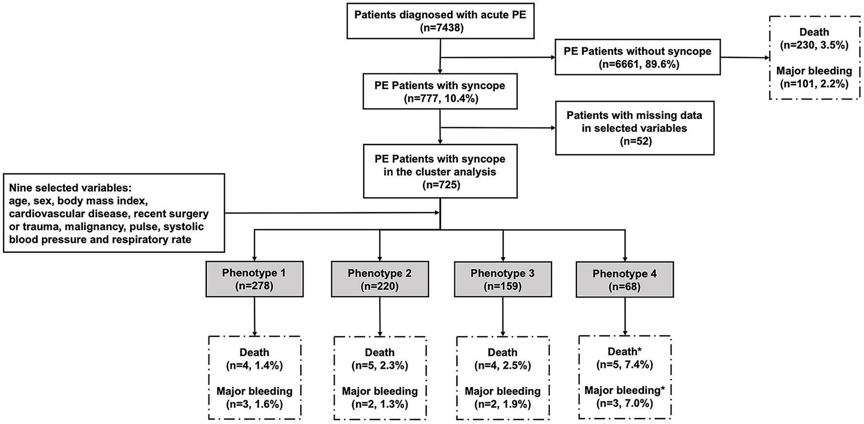 The flowchart of the study. We enrolled 7,438 patients confirmed with acute PE, in which 777 patients had syncope as one of initial symptoms. Nine variables were selected for their relevance to syncope and PE: age, sex, body mass index, cardiovascular disease, recent surgery or trauma, malignancy, pulse, systolic blood pressure, and respiratory rate. Complete data for the nine variables were available for 725 subjects with syncope. In the system cluster analysis, they were classified into four phenotypes, with different outcomes during admission. *The difference is statistically significant compared with other phenotypes.