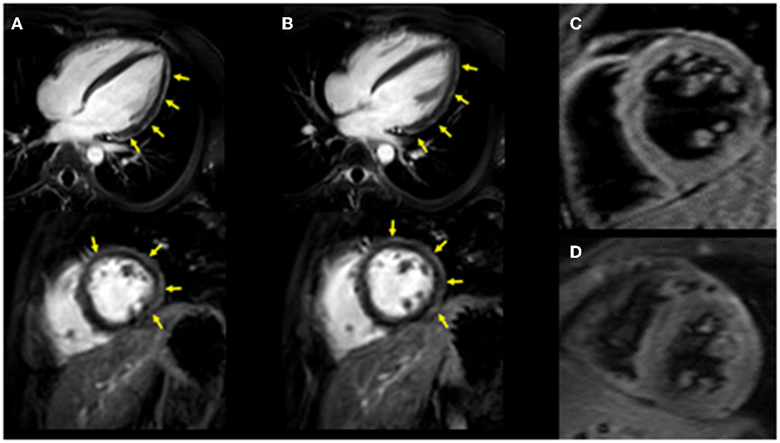 Cardiac MRI imaging. Diffuse late gadolinium enhancement at the epicardium was observed in both images. (A) Images obtained 3 years ago when he suffered from his previous myocarditis (top: long-axis view, bottom: short-axis view). (B) Images obtained during the current myocarditis episode associated with coronavirus disease-2019 (COVID-19) messenger RNA (mRNA) vaccination (top: long-axis view, bottom: short-axis view). T2-weighted MR images. (C) Image obtained 3 years ago when he suffered from his previous myocarditis episode. (D) Image obtained during the current myocarditis episode associated with COVID-19 mRNA vaccination.