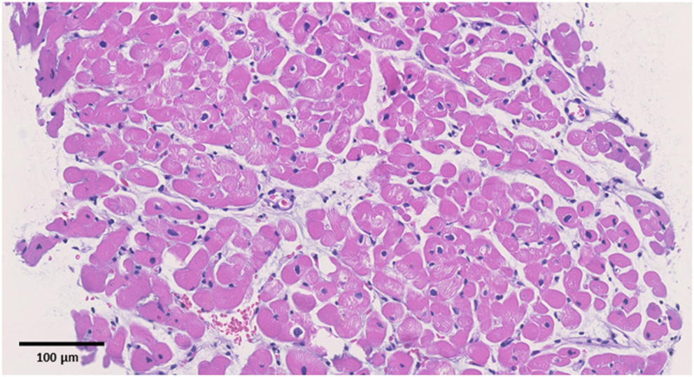 Upon admission to our hospital, the patient had blood pressure, heart rate, and body temperature of 135/65 mmHg, 97 bpm, and 37.3°C, respectively. Chest radiography showed no signs of cardiomegaly or pulmonary congestion. Blood tests revealed an elevation in white blood cells (9,560/μl) and C-reactive protein (4.44 mg/dl, normal range ≤0.3 mg/dl), together with elevations in cardiac enzymes, including CK (818 IU/L, normal range 62–287 IU/L), CK-MB (59 IU/L, normal range 2–21 IU/L), and cardiac troponin T (1.41 ng/ml, normal range ≤0.014 ng/ml). The N-terminal pro-brain natriuretic peptide (NT-pro BNP) level was also elevated (221.2 pg/ml, normal range ≤ 125 pg/ml). Electrocardiography revealed ST elevations in V2–V5 leads, whereas echocardiography revealed systolic dysfunction (LVEF = 55%) associated with left ventricular dilatation (LVDd, 55 mm) without any pericardial effusion. Coronary CT showed no signs of coronary atherosclerosis. A myocardial specimen obtained from the septum of the right ventricle showed no apparent signs of myocardial destruction or inflammation (Figure 2). Hemodynamic evaluation by Swan–Ganz catheterization revealed a pulmonary artery pressure of 27/11 (19) mmHg, pulmonary capillary wedge pressure of 13 mmHg, and cardiac output of 6.62 L/min. Cardiac MRI revealed diffuse late gadolinium enhancement at the epicardium (Figure 1B) that was similar but somewhat different from the images observed 3 years prior when he suffered from his previous myocarditis (Figure 1A). A T2-weighted MRI revealed diffuse high-intensity areas, suggesting edematous changes in the left ventricle during his previous bout of myocarditis, as well as during the current myocarditis (Figures 1C,D). Enzyme-linked immunosorbent assays of sera were all negative for potential causes of viral myocarditis (Coxsackie, echo, influenza A and B, cytomegalovirus, and Epstein-Barr virus (EBV)]. Negative T waves were observed in V3 to V6 leads following electrocardiography on day 5 (Supplemental Material). All the aforementioned results, except for pathological findings from the myocardial specimen, were consistent with a diagnosis of COVID-19 mRNA vaccination-related myocarditis. We ruled out acute coronary syndrome given the absence of cardiac asynergy and cardiac MRI findings. We also ruled out acute systolic heart failure of any cause based on the hemodynamic evaluation findings by Swan–Ganz catheterization.