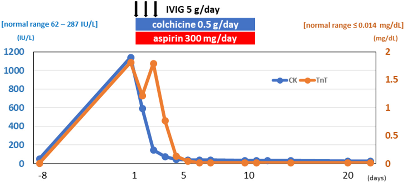 The patient was started on IVIG treatment (5 g/day × 3 days), colchicine (0.5 g/day × 14 days), and aspirin (300 mg/day × 14 days) (Figure 3). The Japanese guideline (9) utilized by our institute has no clear first-choice therapy for this situation. Among several potential medical therapies, we opted to use IVIG to avoid complications when using immunosuppressive agents. The CK, CK–MB, cardiac troponin T, and NT-proBNP levels gradually returned to normal, and follow-up echocardiography showed normal cardiac function (LVEF = 68%). After being hospitalized for a total of 23 days, the patient was discharged without any symptoms.