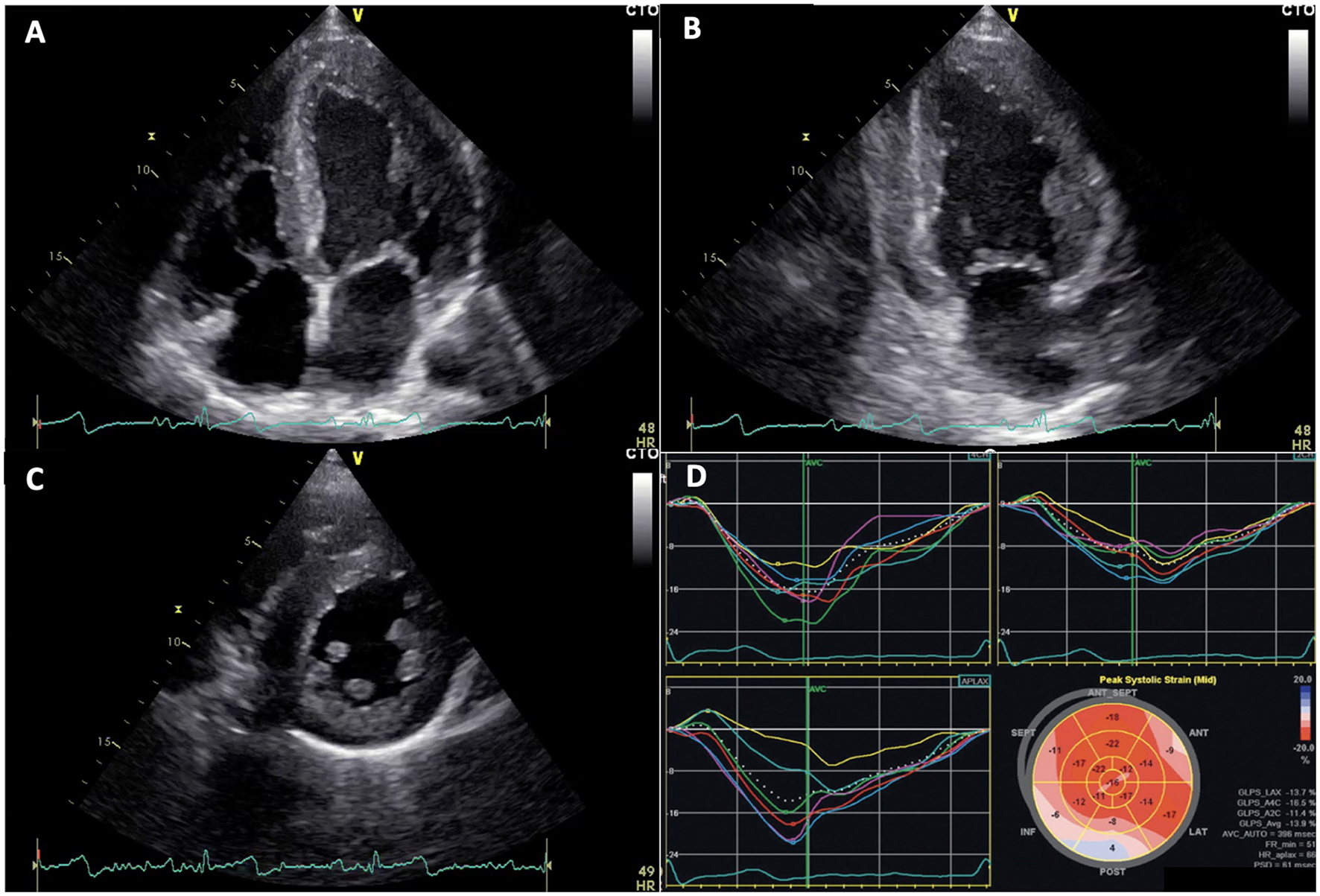Patient #1 is a 57-year-old woman with a history of acroparesthesias, recurrent headache, and abdominal pain, who was admitted to our echo-lab because of a cardiovascular screening program dedicated to hospital employees, in the absence of known cardiac problems and/or family history. ECG showed a sinus rhythm with a cardiac frequency of 60 bpm without abnormalities of repolarization. Echocardiography showed concentric LVH with a septum of 14 mm and a normal systolic left ventricular ejection fraction (LVEF = 56%, but a type I diastolic dysfunction. GLS was within lower range (−18.7%; n.v. from −15.9 to −22.1%). Neurological examination revealed no apparent deficit, as ophthalmologic examination (performed after the FD diagnosis) did not show signs of tortuous vessels or cornea verticillata. Her laboratory exams also resulted in the normal range, particularly no signs of chronic kidney disease were detected. α-Gal A activity was normal (≥15.3 μmol/l/h), but genetic examination showed a heterozygous mutation in exon 3 of the GLA gene, c.388A > G (p.Lys130Glu), a novel variant just described from our group. Plasma concentration of lyso-Gb3 (4.0 ng/ml, n.v. ≤ 1.8 ng/ml) was pathologically elevated. On these grounds, this novel mutation was considered as pathogenic. Furthermore, among the patient's relatives, the same gene mutation was observed in her son, who also showed decreased α-Gal A enzymatic activity (<0.8 μmol/l/h; n.v. ≥ 15.3 μmol/l/h) and elevated lyso-Gb3 levels (18.1 ng/ml; n.v. ≤ 1.8 ng/ml), leading to the diagnosis of overt FD.