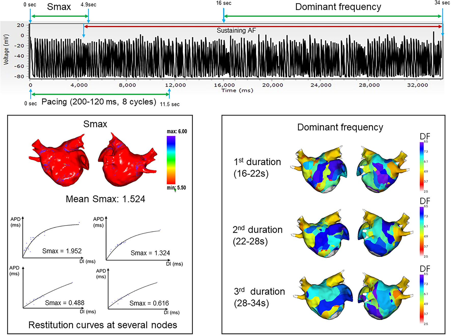 Summary and example of how the Smax and dominant frequency were measured during the virtually induced atrial fibrillation. Smax, the maximal slope of action potential restitution curve; DF, dominant frequency.