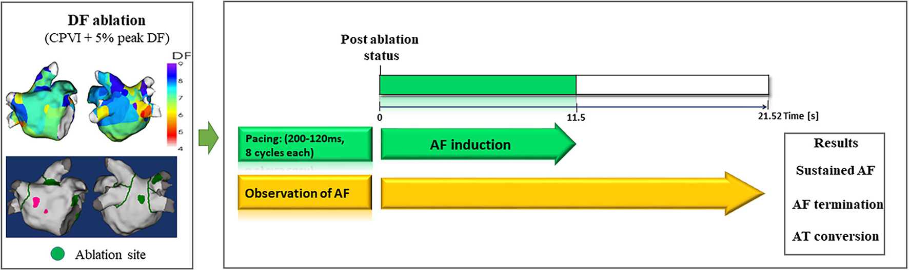 Study protocol of computational virtual DF ablation and AF induction on postablation status. DF, dominant frequency; AF, atrial fibrillation; AT, atrial tachyarrhythmia.