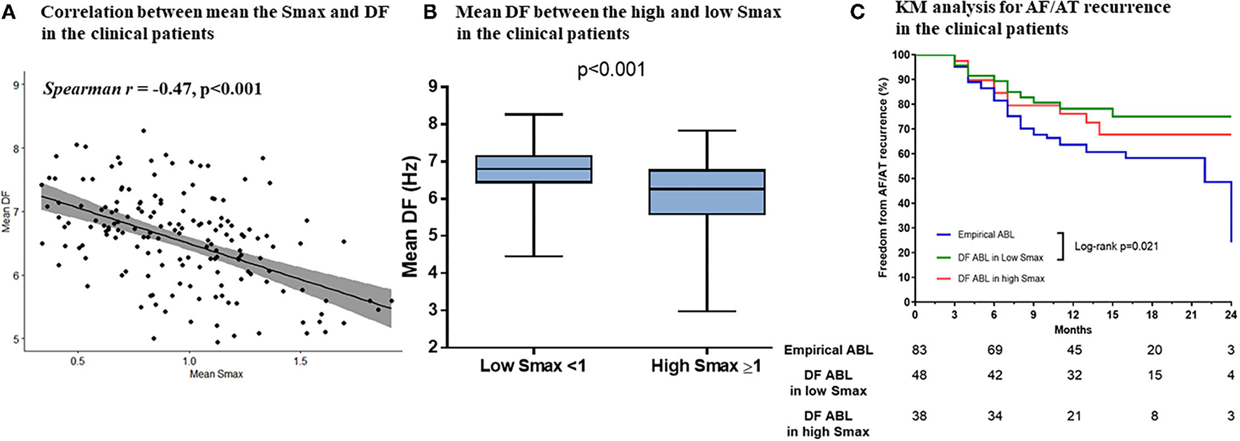 The relationship between the Smax and DF in the clinical patients from the CUVIA AF2 population. The correlation between the Smax and DF in the clinical patients (A). Comparing the DF between low Smax (<1) and high Smax (≥1) conditions in the clinical patients (B). Kaplan–Meier (KM) analysis for clinical AF/AT recurrence among three ablation groups in the clinical patients (C). Smax, the maximal slope of action potential restitution curve; DF, dominant frequency; AF, atrial fibrillation; AT, atrial tachycardia; ABL, ablation.